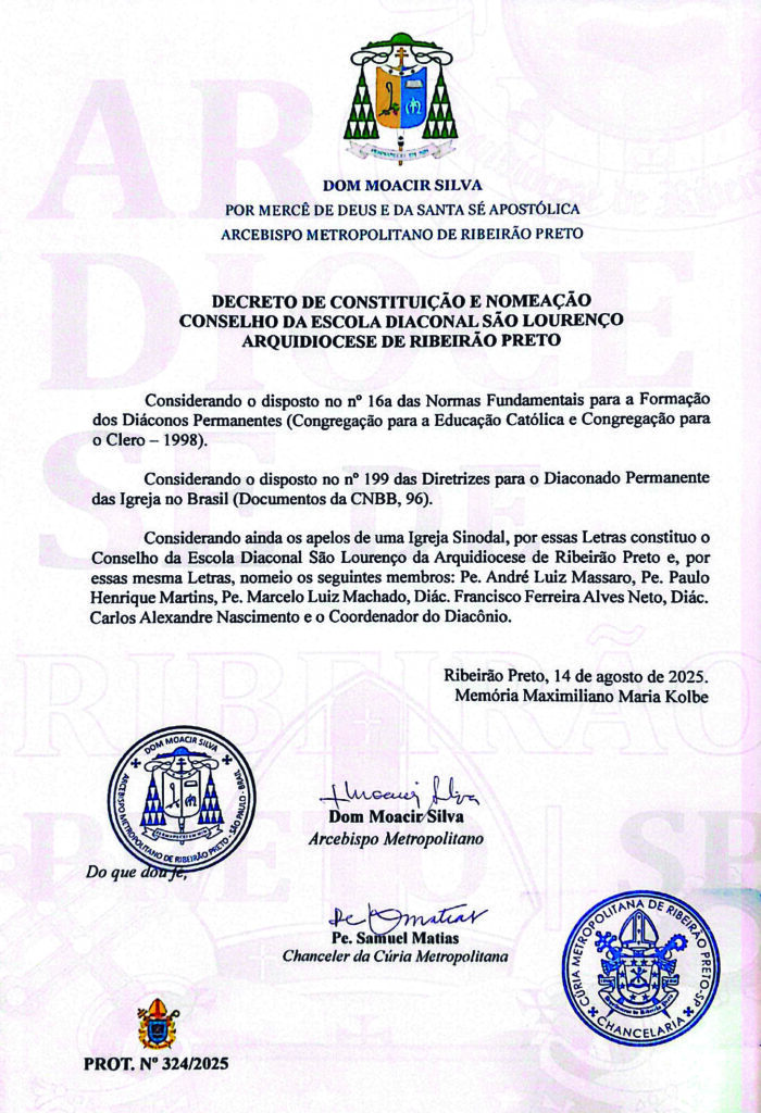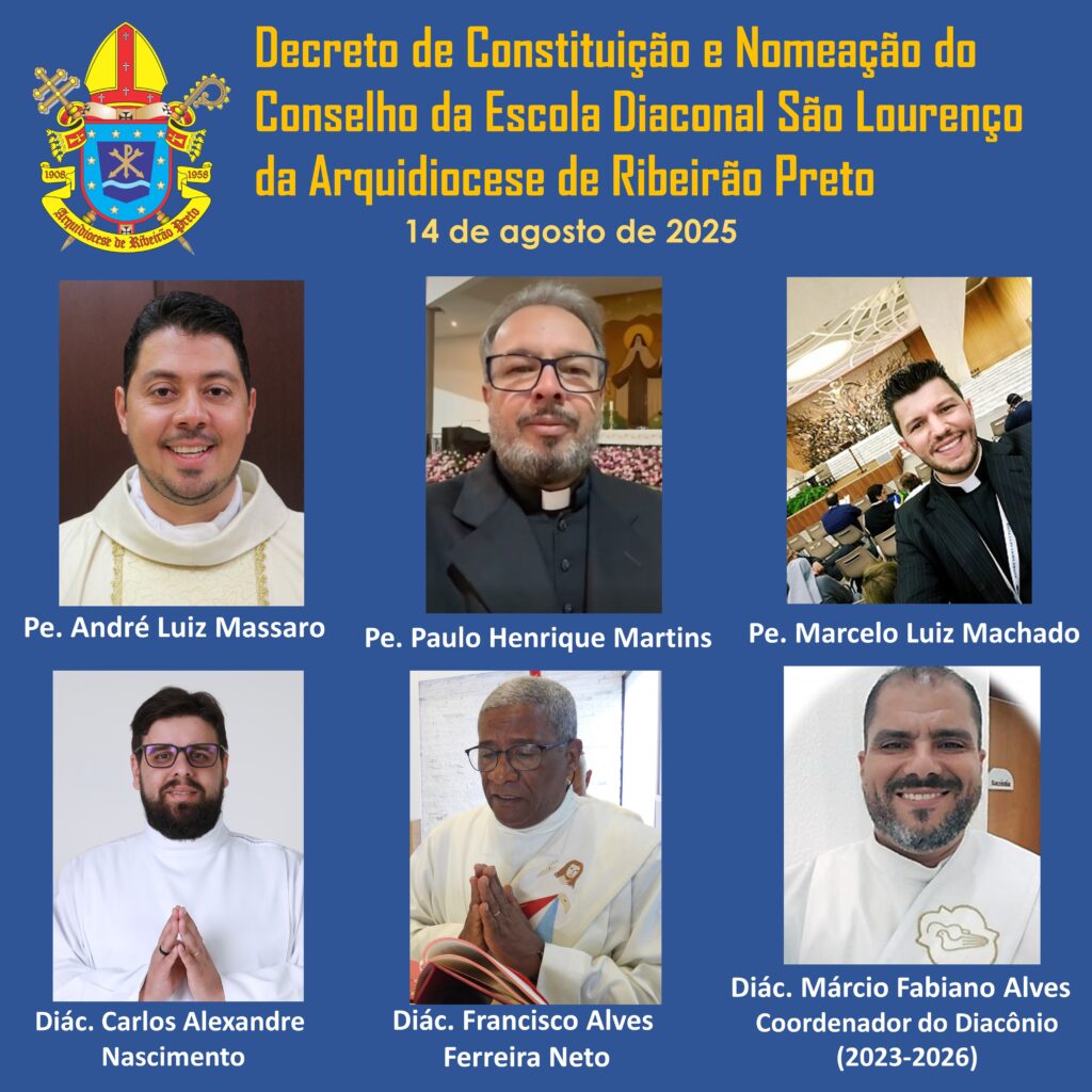 A Chancelaria da Arquidiocese de Ribeirão Preto torna pública a determinação de Dom Moacir Silva, Arcebispo Metropolitano de Ribeirão Preto, na Memória de São Maximiliano Kolbe, em 14 de agosto de 2025, com a publicação do Decreto de Constituição e Nomeação do Conselho da Escola Diaconal São Lourenço da Arquidiocese de Ribeirão Preto. O Conselho conta com os seguintes membros: Pe. André Luiz Massaro, Pe. Paulo Henrique Martins, Pe. Marcelo Luiz Machado, Diác. Francisco Alves Ferreira Neto, Diác. Carlos Alexandre Nascimento e o Coordenador do Diacônio.
