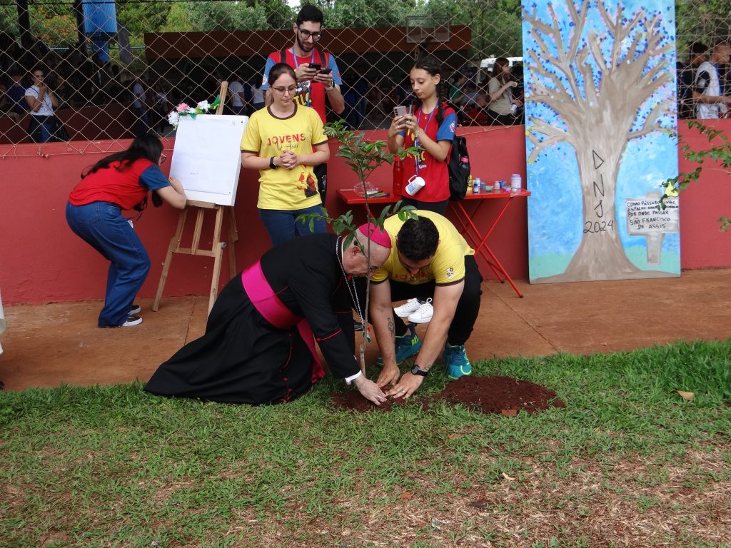 Terminada a missa, o padre Luís Gustavo se dirigiu aos jovens para uma breve explicação do gesto concreto do DNJ 2024, em sintonia com o tema “Fraternidade e Amizade Social”, e especialmente unido ao padroeiro da paróquia anfitriã São Francisco de Assis. “Nós não conseguimos levar vocês à paróquia, mas nós queremos trazer um pouco da paróquia para, sobretudo, compartilhar com vocês a enorme espiritualidade de São Francisco de Assis, que lá nos anos de 1983 foi colocado como o padroeiro daquela comunidade. Ele vive a amizade na sua complexidade total e consegue fazer isso graças ao seu amor por Jesus Cristo. Neste ano nós celebramos os 800 anos da estigmatização de São Francisco. Faz 800 anos que ele recebeu em seu corpo as marcas das chaves de Jesus. E isso foi um prêmio que o próprio Jesus lhe deu e ele vive em fraternidade com toda a obra da criação. Ao chegarem aqui vocês recebem uma caneca e como um gesto de compromisso e cuidado com a ecologia vocês devem usá-la hoje e por quanto tempo quiserem para o consumo da água. E um outro gesto concreto também de cuidado com a ecologia como nos ensina São Francisco, ao final do dia nós vamos entregar para cada cidade da nossa arquidiocese uma árvore, uma muda de árvore para que seja plantada na cidade de vocês e se torne a árvore da juventude. E, neste momento dom Moacir vai plantar uma árvore aqui no CSU para ser a árvore da juventude. A árvore do Dia Nacional da Juventude”, finalizou padre Gustavo.