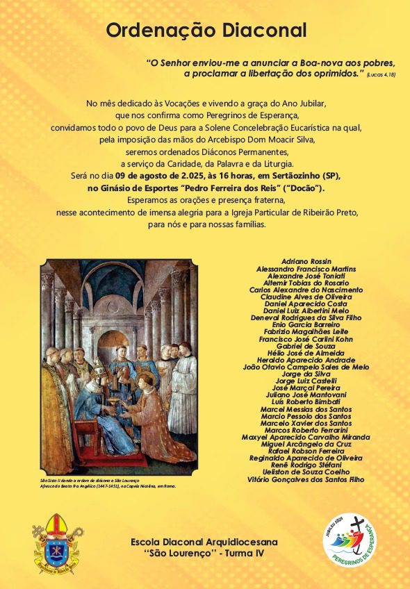 Como o lema diaconal: “O Senhor enviou-me a anunciar a boa-nova aos pobres, a proclamar a libertação dos oprimidos” (Lucas 4, 18), a Escola Diaconal Arquidiocesana São Lourenço convida para a ordenação dos 32 alunos da quarta turma da escola.