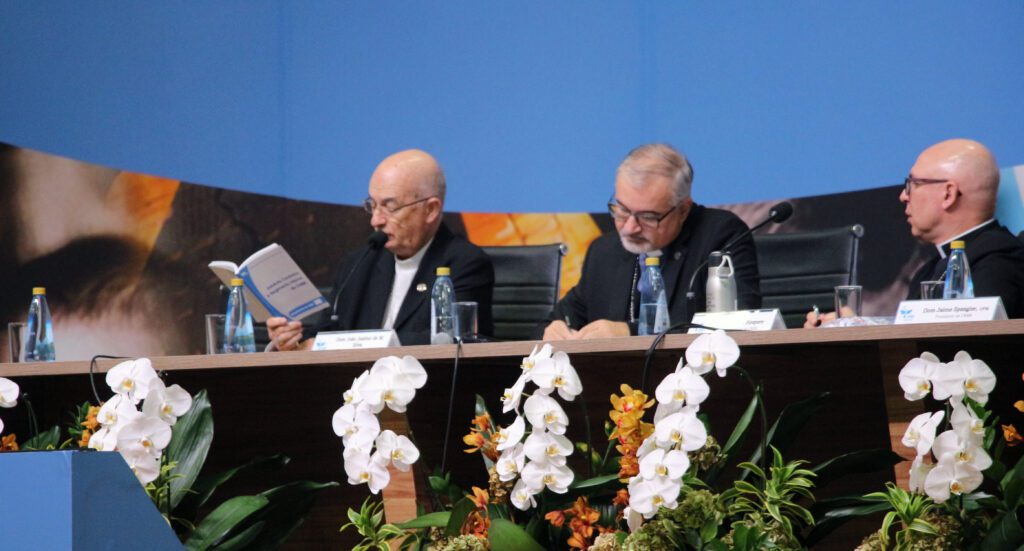 O arcebispo de Santa Maria, dom Leomar Brustolin, presidente da Comissão Episcopal para a Animação Bíblico-Catequética e do regional Sul 3 da CNBB, e presidente da Comissão do Tema Central da Assembleia, comentou o processo de atualização das Diretrizes Gerais da Ação Evangelizadora (DGAE): “Vocês sabem que já deveríamos ter aprovado em 2023, mas foi protelado até 2025, o processo de construção das novas diretrizes. Por que? Por causa dos novos desafios que estão aparecendo, por causa do Sínodo. Então algumas ideias novas estão aparecendo. Partimos de um pressuposto: usamos a imagem da casa para construir as comunidades, e desde o ano passado estamos usando a imagem da tenda. A tenda porque precisamos alargar o espaço, e existem novidades nos últimos cinco anos que nós ainda não tínhamos contemplado, e isto a evangelização precisa contar. Um exemplo: toda a questão da inteligência artificial, o quanto vai impactar sobre as nossas vidas e sobre a evangelização. Como transmitir a fé para jovens e crianças? Onde estão os jovens? Com quem estão? Onde estão as crianças? Esta é uma questão importante: alargar a tenda”, refletiu dom Leomar.