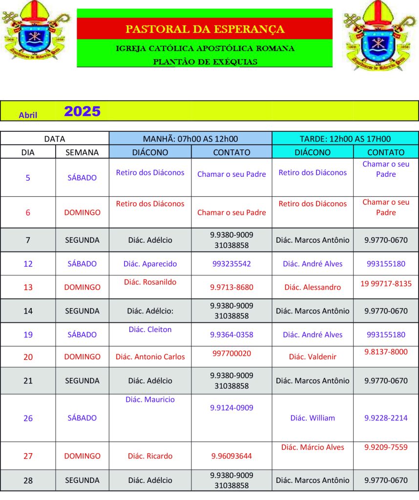 Escala Diaconado Permanente – Exéquias – Mês de ABRIL 2025