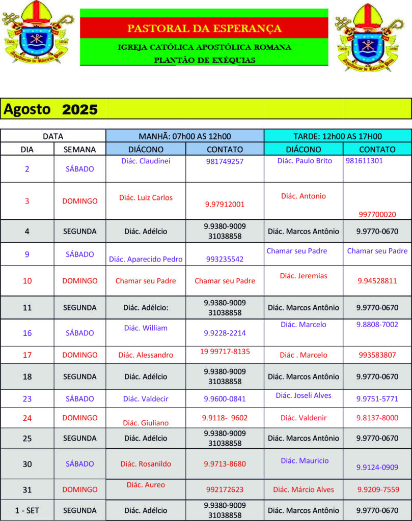 Escala Diaconado Permanente – Exéquias – Mês de AGOSTO 2025