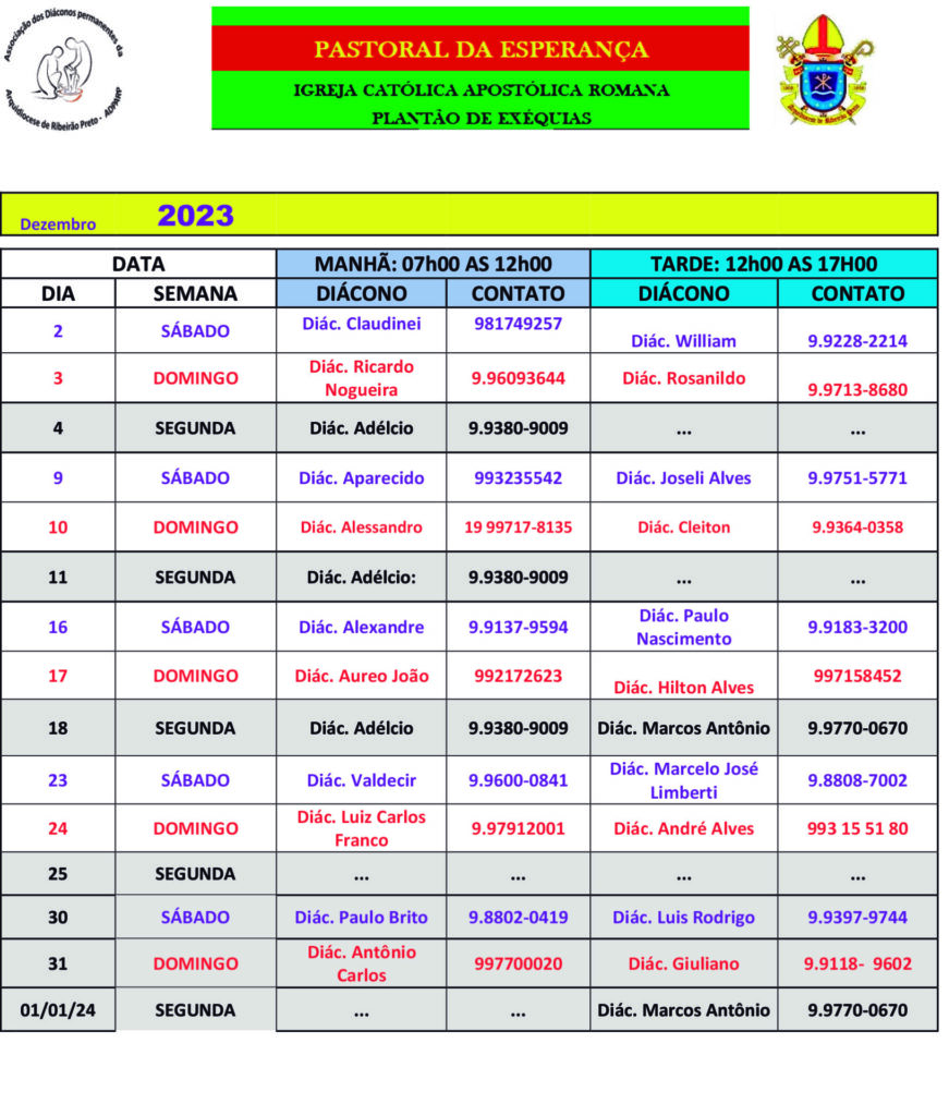 A Associação dos Diáconos da Arquidiocese de Ribeirão Preto (ADPARP) divulga a Escala de Exéquias (Celebração Exequial nos Velórios) para o mês de DEZEMBRO de 2023 (final de semana e segunda-feira) para atendimento nos velórios de Ribeirão Preto. Este serviço faz parte do Ministério da Caridade aos que os diáconos são chamados a realizar.