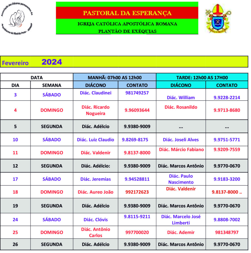 A Associação dos Diáconos da Arquidiocese de Ribeirão Preto (ADPARP) divulga a Escala de Exéquias (Celebração Exequial nos Velórios) para o mês de FEVEREIRO de 2024 (final de semana e segunda-feira) para atendimento nos velórios de Ribeirão Preto. Este serviço faz parte do Ministério da Caridade aos que os diáconos são chamados a realizar.
