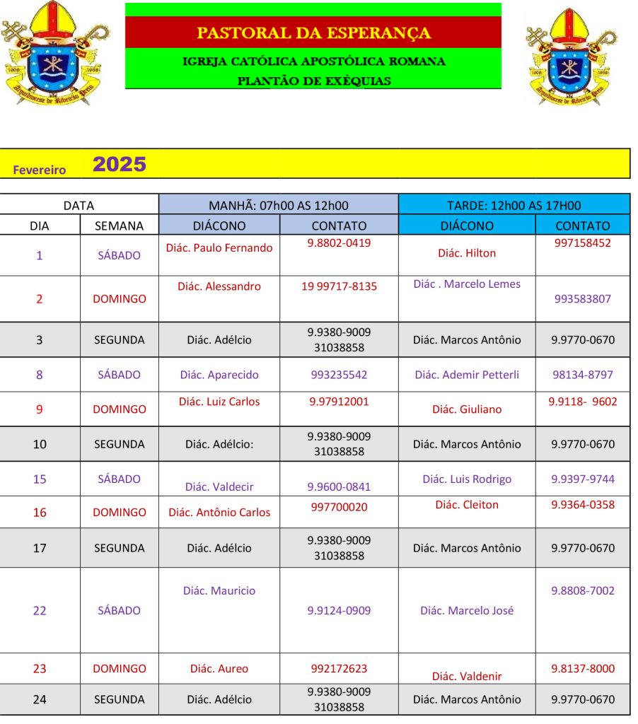 Escala Diaconado Permanente – Exéquias – Mês de FEVEREIRO 2025