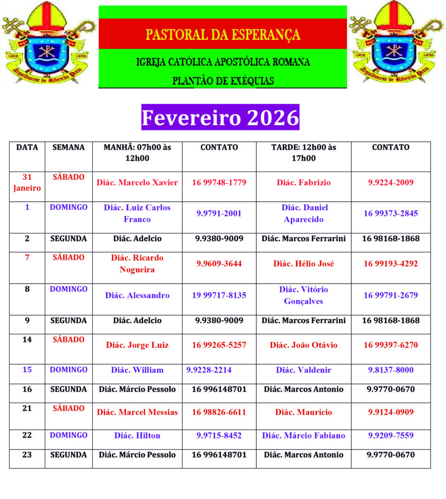 A Associação dos Diáconos da Arquidiocese de Ribeirão Preto (ADPARP) divulga a Escala de Exéquias (Celebração Exequial nos Velórios) para o mês de FEVEREIRO de 2026 (final de semana e segunda-feira) para atendimento nos velórios de Ribeirão Preto. Este serviço faz parte do Ministério da Caridade aos que os diáconos são chamados a realizar.