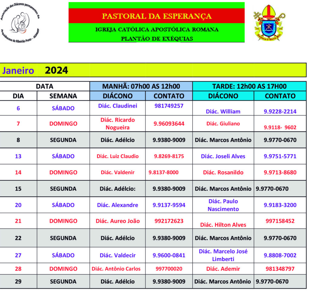 A Associação dos Diáconos da Arquidiocese de Ribeirão Preto (ADPARP) divulga a Escala de Exéquias (Celebração Exequial nos Velórios) para o mês de JANEIRO de 2024 (final de semana e segunda-feira) para atendimento nos velórios de Ribeirão Preto. Este serviço faz parte do Ministério da Caridade aos que os diáconos são chamados a realizar.