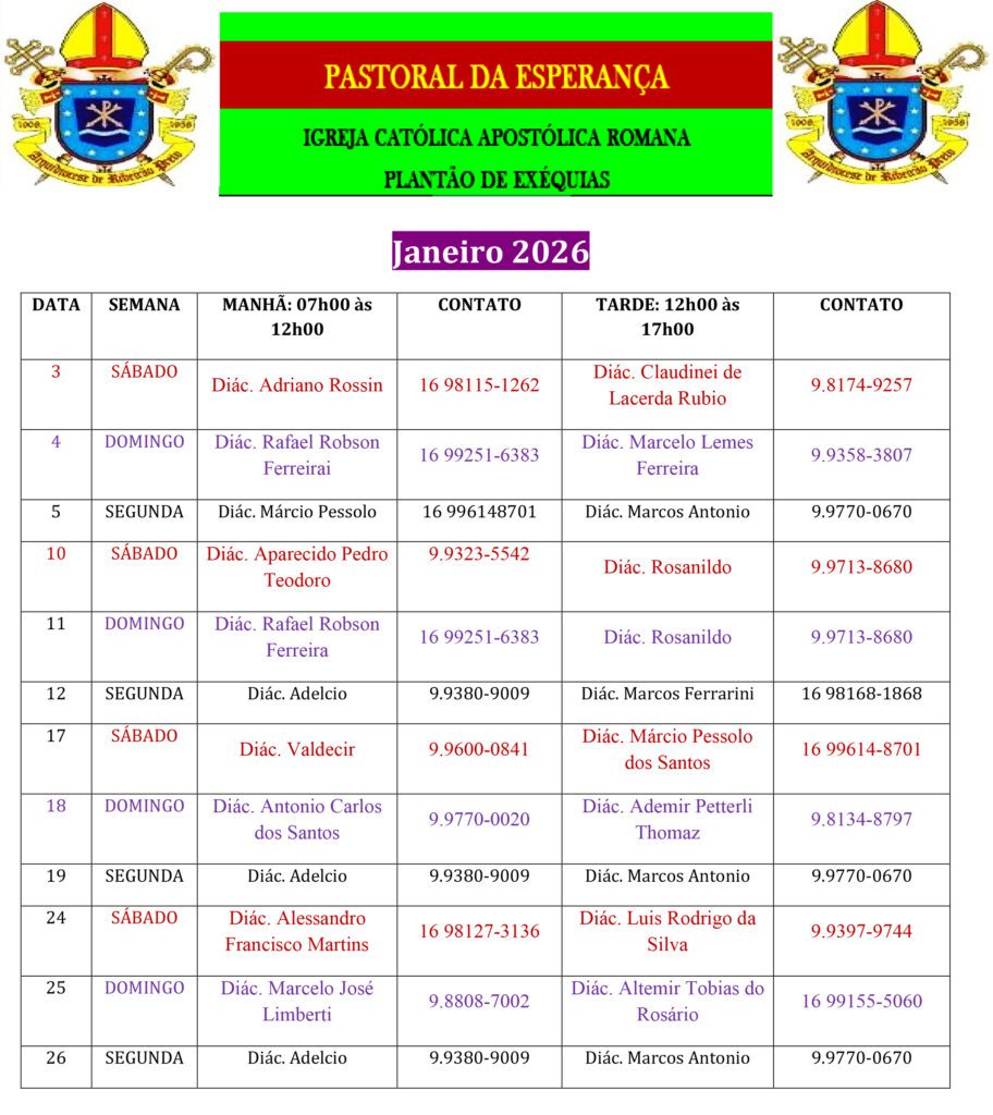 A Associação dos Diáconos da Arquidiocese de Ribeirão Preto (ADPARP) divulga a Escala de Exéquias (Celebração Exequial nos Velórios) para o mês de JANEIRO de 2026 (final de semana e segunda-feira) para atendimento nos velórios de Ribeirão Preto. Este serviço faz parte do Ministério da Caridade aos que os diáconos são chamados a realizar.