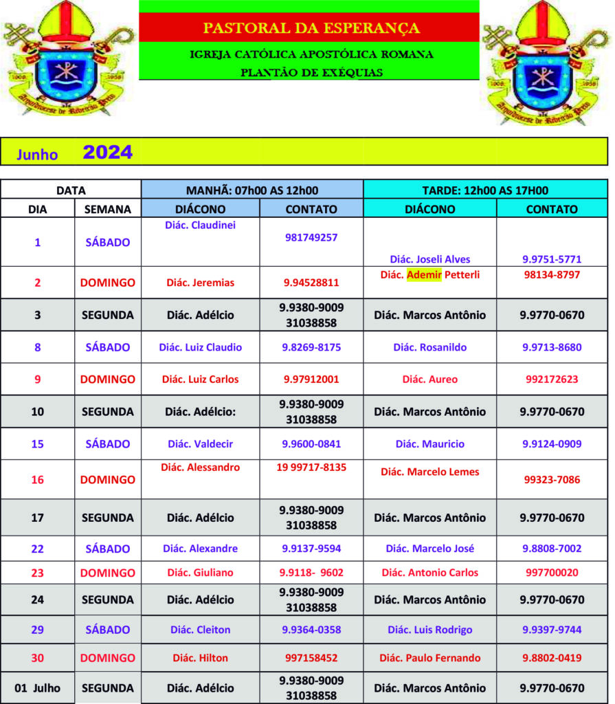 Escala Diaconado Permanente – Exéquias – Mês de JUNHO 2024