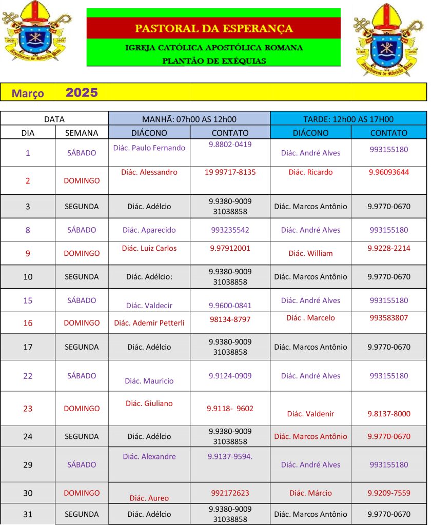 Escala Diaconado Permanente – Exéquias – Mês de MARÇO 2025