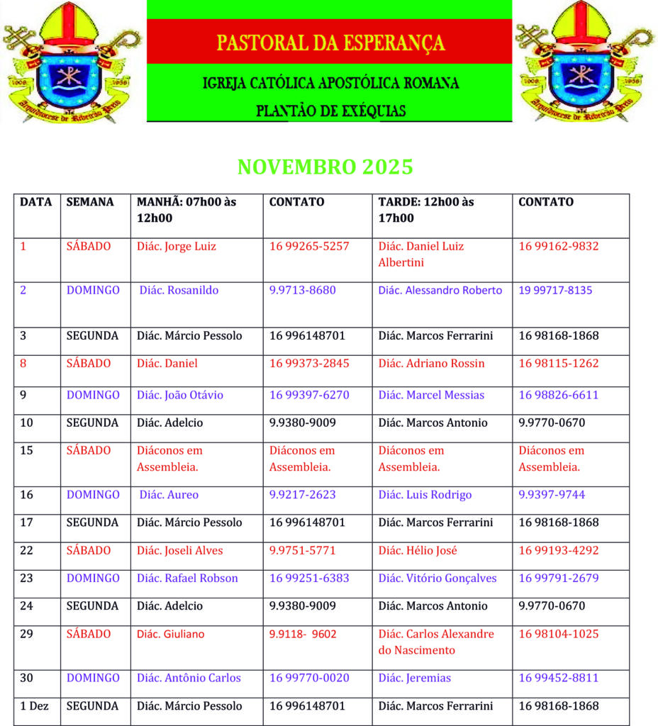 A Associação dos Diáconos da Arquidiocese de Ribeirão Preto (ADPARP) divulga a Escala de Exéquias (Celebração Exequial nos Velórios) para o mês de NOVEMBRO de 2025 (final de semana e segunda-feira) para atendimento nos velórios de Ribeirão Preto. Este serviço faz parte do Ministério da Caridade aos que os diáconos são chamados a realizar.