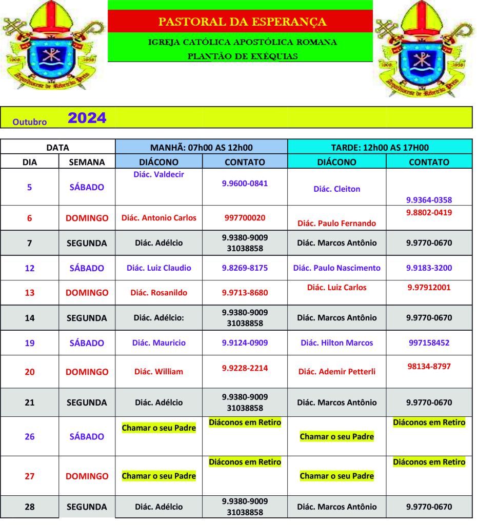 Escala Diaconado Permanente – Exéquias – Mês de OUTUBRO 2024