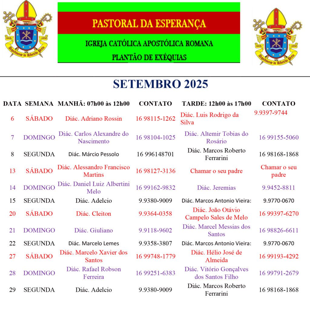 A Associação dos Diáconos da Arquidiocese de Ribeirão Preto (ADPARP) divulga a Escala de Exéquias (Celebração Exequial nos Velórios) para o mês de SETEMBRO de 2025 (final de semana e segunda-feira) para atendimento nos velórios de Ribeirão Preto. Este serviço faz parte do Ministério da Caridade aos que os diáconos são chamados a realizar.