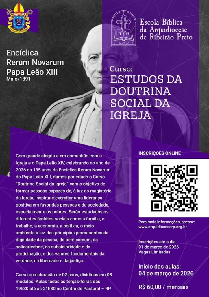 Com grande alegria e em comunhão com Igreja e o Papa Leão XIV, celebrando no ano de 2026 os 135 anos da Encíclica Rerum Novarum, do Papa Leão XIII, damos por criado o Curso “Doutrina Social da Igreja” com o objetivo formar pessoas capazes de, à luz do magistério da Igreja, inspirar e exercitar uma liderança positiva em favor das pessoas e da sociedade, especialmente os pobres. Serão estudados os diferentes âmbitos sociais como a família, o trabalho, a economia, a política, o meio ambiente à luz dos princípios permanentes da dignidade da pessoa, do bem comum, da solidariedade, da subsidiaridade e da participação, e dos valores fundamentais da verdade, da liberdade e da justiça.