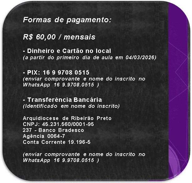 AULAS: O curso tem duração de dois anos divididos em 8 módulos. As aulas terão início em 04 de março de 2026, e acontecerão todas as terças-feiras, das 19h30 até 21h30, no Centro Arquidiocesano de Pastoral. O investimento é de R$ 60,00 mensais.