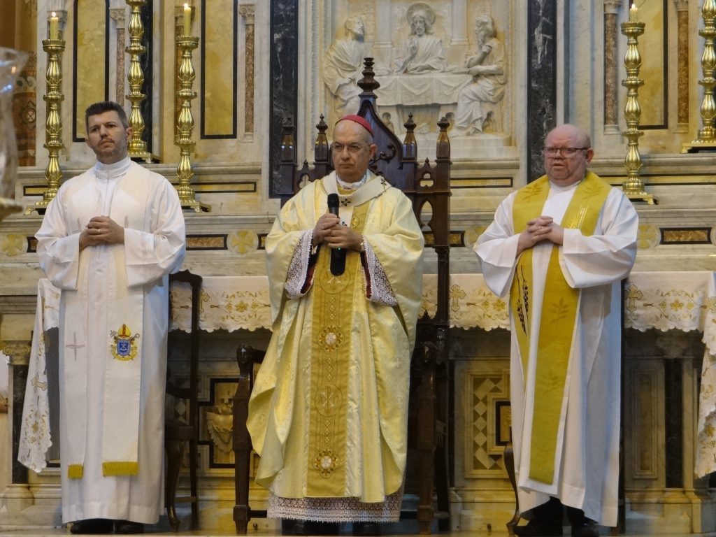 Homilia: No início da homilia, dom Moacir, ressaltou a importância da valorização e da formação permanente dos catequistas nas comunidades paroquiais. “Hoje rendemos graças da Deus, nosso Senhor, pela formatura da primeira turma de nossa Escola Catequética. Aqui lembramos uma palavra do Documento Final do Sínodo: ‘Entre as práticas formativas que podem receber novo impulso a partir da sinodalidade, é dada particular atenção à catequese para que, além de diminuir nos itinerários da Iniciação Cristã, seja cada vez mais ‘em saída’ e extrovertida… Em muitas Igrejas, os catequistas são o recurso fundamental para o acompanhamento e a formação; noutras, o seu serviço deve ser mais valorizado e apoiado pela comunidade, afastando-se de uma lógica de delegação, que contradiz a sinodalidade. Considerando a dimensão dos fenômenos migratórios, é importante que a catequese promova o conhecimento mútuo entre as Igrejas dos países de origem e de acolhimento’ (DF, 145)”, destacou o arcebispo.