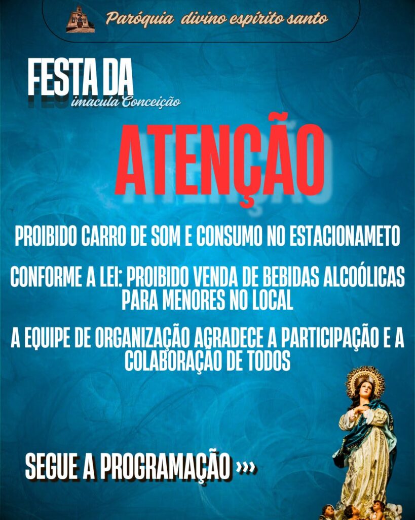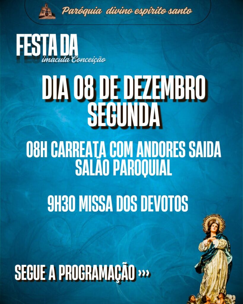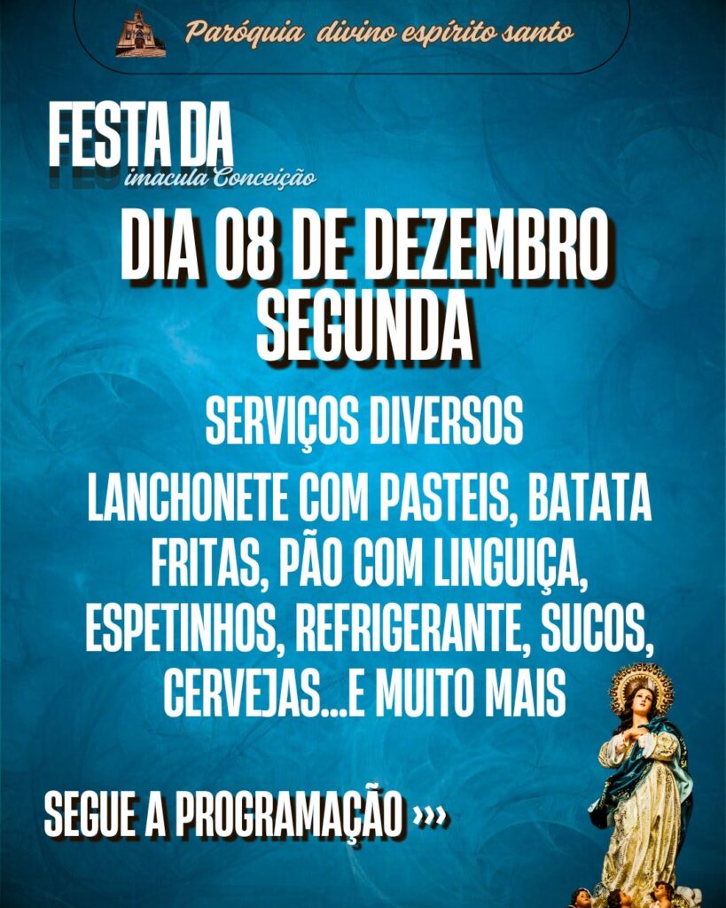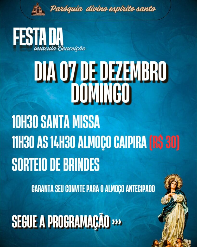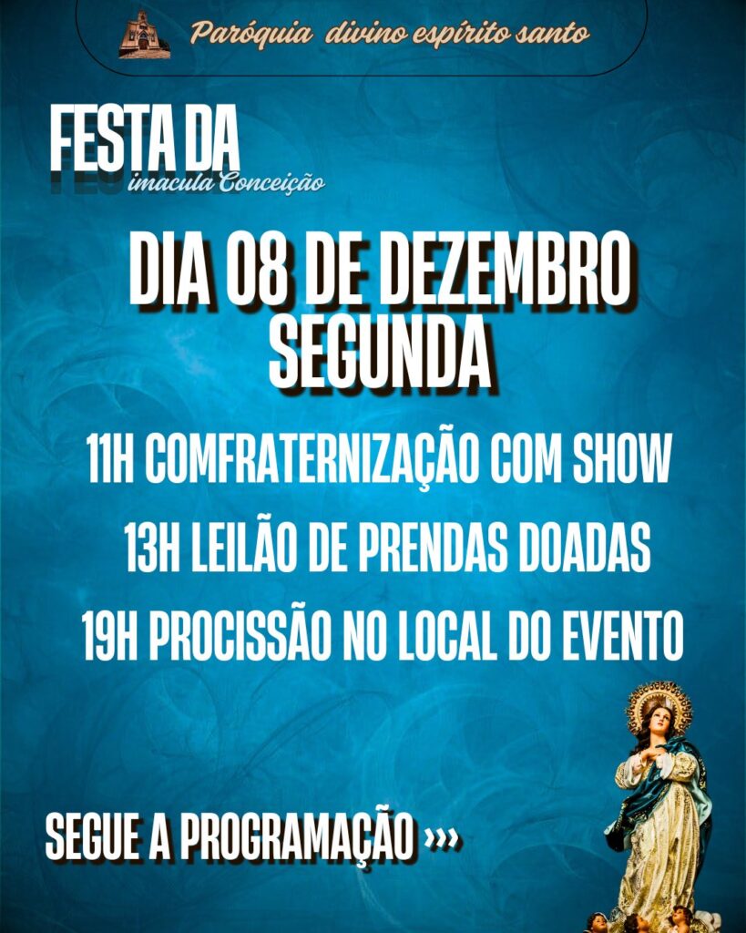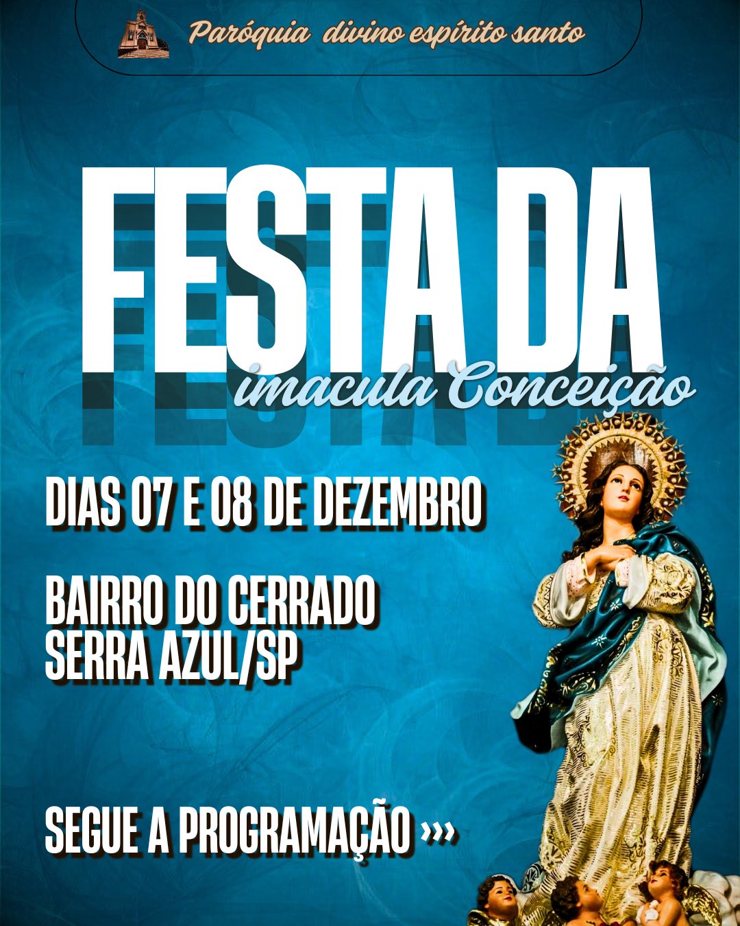 Confira a programação da Festa da Imaculada Conceição, no Bairro Cerrado, em Serra Azul, no dia 8 de dezembro.