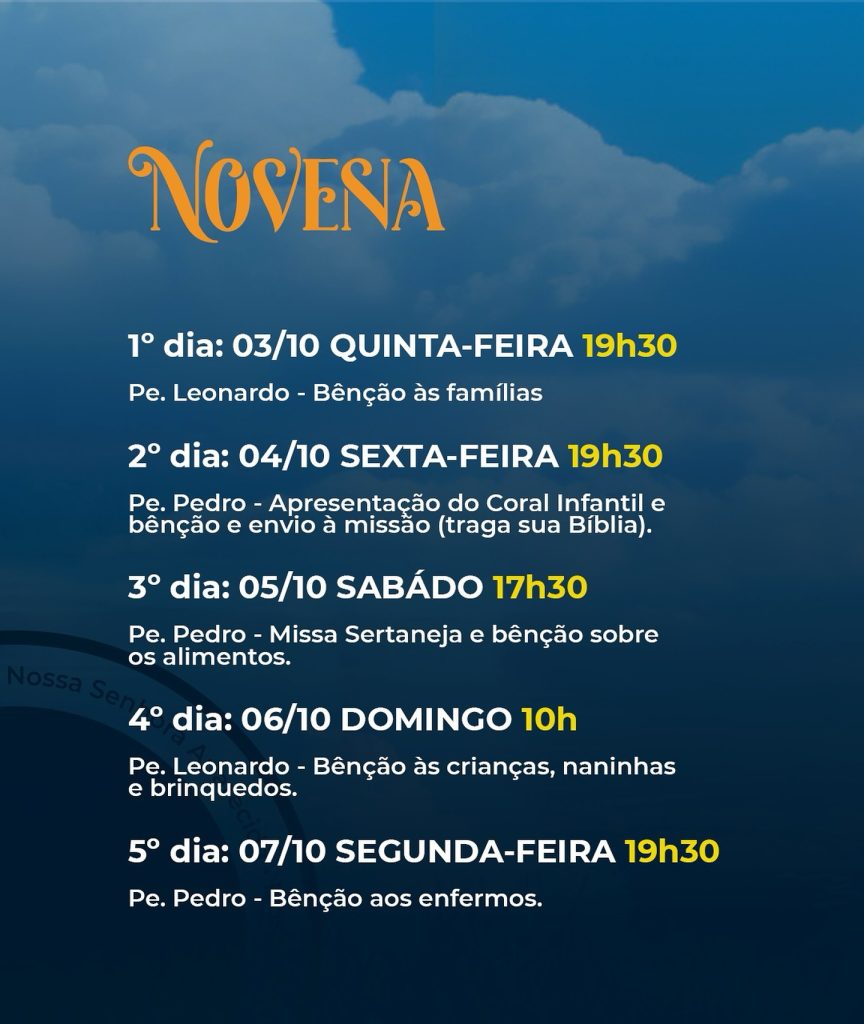 ▪3º dia: 05/10 SAB 17h30 – Missa Sertaneja e bênção sobre os alimentos.