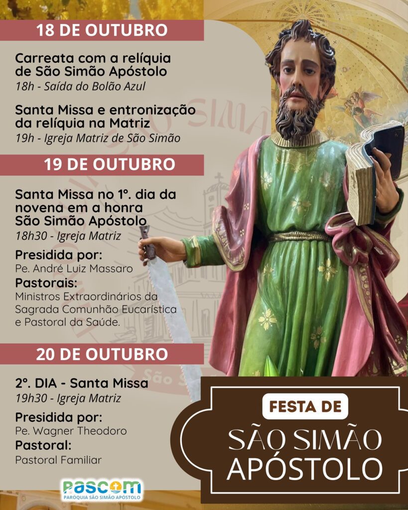 Novena: 19 a 27 de outubro, na Igreja Matriz São Simão Apóstolo (horários no banner)
