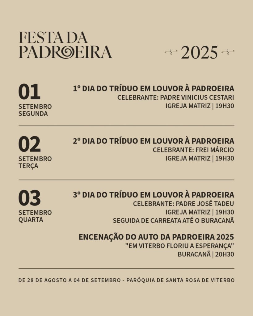 Tríduo da Padroeira: 1 a 3 de setembro (Igreja Matriz), às 19h30.