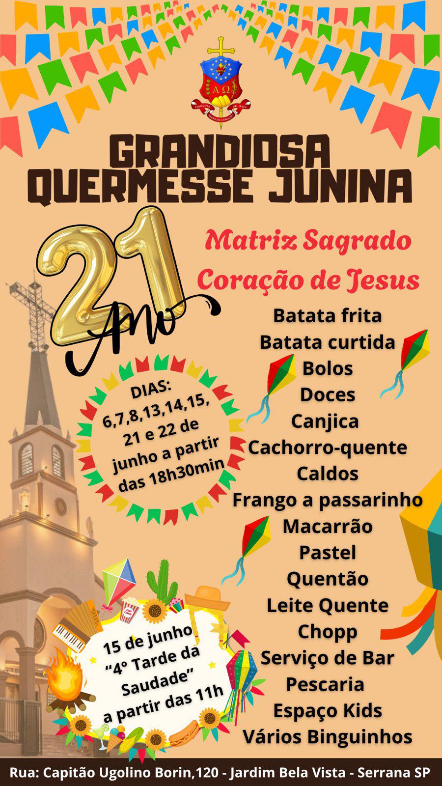 A paróquia Sagrado Coração de Jesus, em Serrana, divulga a programação da Quermesse Junina.