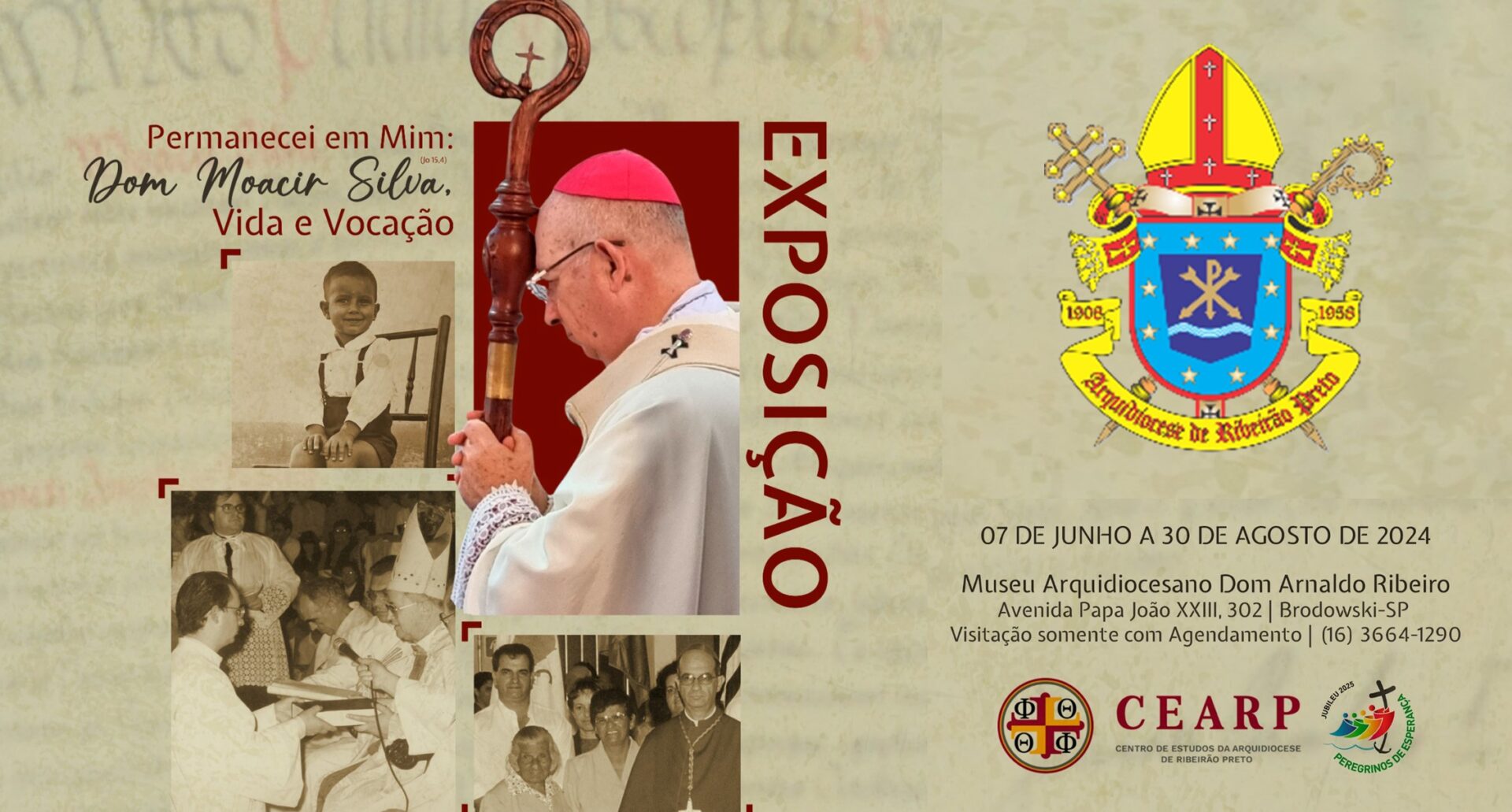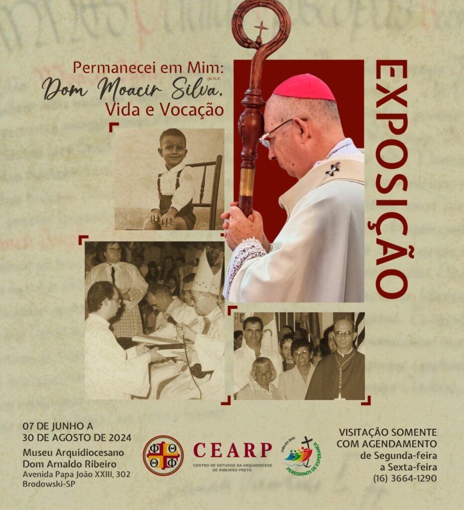 Neste ano de 2024, nosso arcebispo Dom Moacir Silva celebrará 70 anos de vida, em 16 de julho, e, em 11 de dezembro, 20 anos de ordenação episcopal. Para marcar as celebrações de datas tão auspiciosas, o Museu Arquidiocesano “Dom Arnaldo Ribeiro” e o CEARP apresentam sua 4ª Exposição: “Permanecei em Mim” (Jo 15,4): Dom Moacir Silva, vida e vocação. Essa homenagem também inaugura uma nova etapa na vida e história do museu: após passar por reforma e ampliação, o espaço para exposições, que antes possuía 92,6 m², agora conta com mais 155 m², totalizando 247,6 m², bem como com banheiros e porta de acesso independente. A exposição apresenta documentos, fotos, paramentos e vários outros itens referentes à vida e vocação de Dom Moacir Silva.