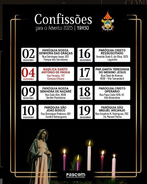 Com o objetivo de atender as confissões no Tempo do Advento, neste Ano Jubilar 2025, as paróquias das foranias da Arquidiocese de Ribeirão Preto, organizam o calendário forâneo para atendimento das confissões.