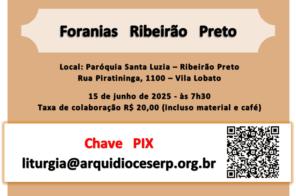 A Comissão Arquidiocesana de Liturgia (CAL) realiza, em 15 de junho, às 7h30, na paróquia Santa Luzia, Rua Piratininga, 1100, Vila Lobato, em Ribeirão Preto, a formação “O Ministério do Salmista na Liturgia da Palavra”, para as paróquias das foranias da cidade de Ribeirão Preto.