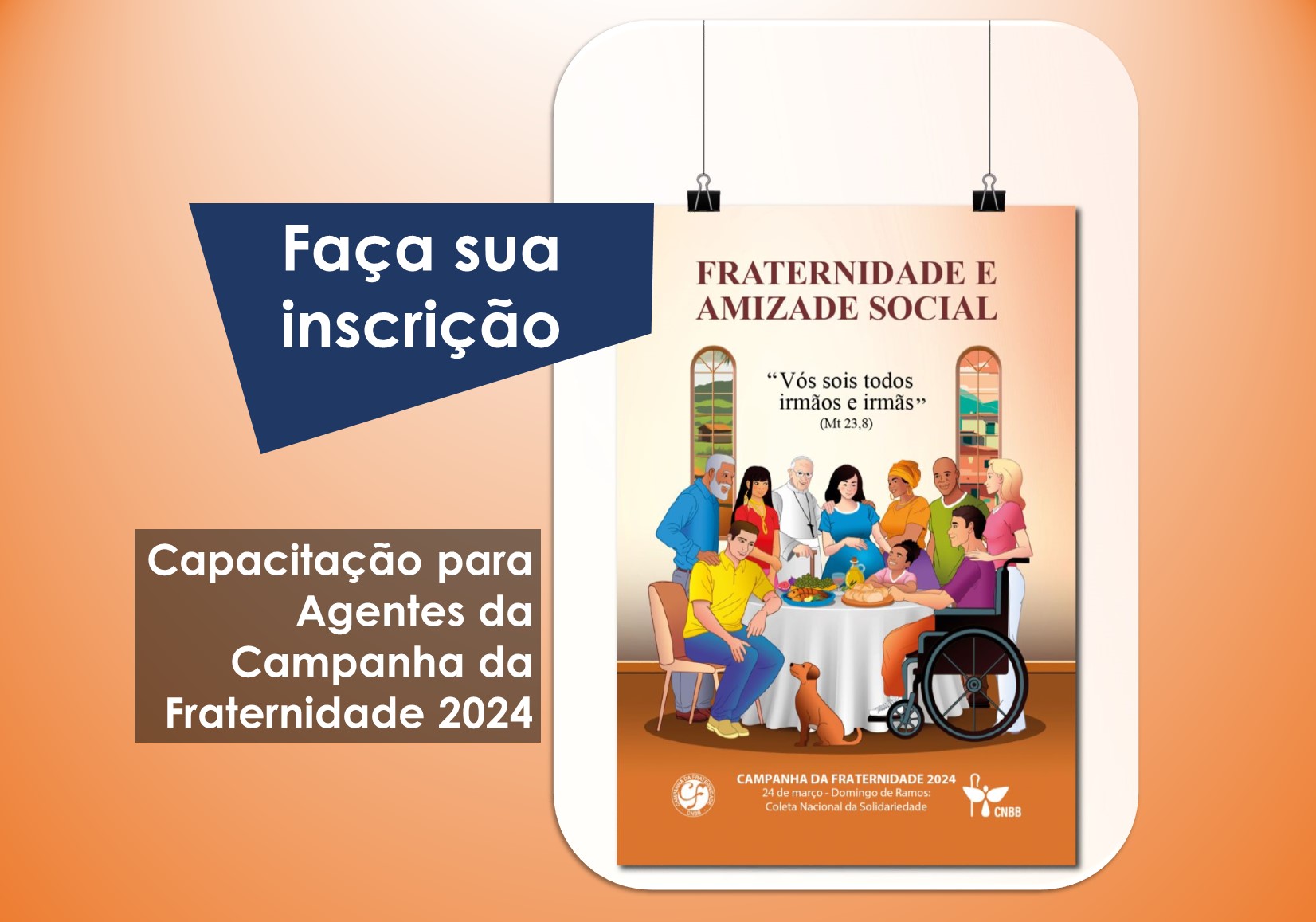 No ano de 2024 a Campanha da Fraternidade terá como tema: “Fraternidade e Amizade Social” e o lema: “Vós sois todos irmãos e irmãs” (Mt 23,8). Assumida pelas Igrejas Particulares da Igreja no Brasil, a Campanha da Fraternidade tornou-se expressão de comunhão, conversão e partilha. Comunhão na busca de construir uma verdadeira fraternidade; conversão na tentativa de deixar-se transformar pela vida fecundada pelo Evangelho; partilha como visibilização do Reino de Deus que recorda a ação da fé, o esforço do amor, a constância na esperança em Cristo Jesus (Cf. 1Ts 1,3).