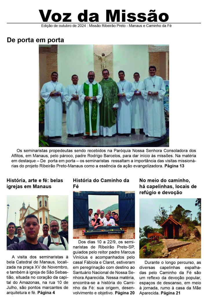 Os cinco seminaristas e o reitor padre Marcus Vinícius Miranda, do Seminário São José e Propedêutico Bom Pastor, da Arquidiocese de Ribeirão Preto, disponibilizam a edição do Jornal “Voz da Missão” com duas experiências missionárias vividas nos meses de agosto e setembro: a Missão na Ação Missionária Ribeirão Preto / Manaus e a peregrinação no Caminha da Fé (Águas da Prata até o Santuário Nacional de Aparecida. Na região amazônica a experiência aconteceu nas paróquias atendidas pela Arquidiocese de Ribeirão Preto: paróquia Nossa Senhora Consoladora dos Aflitos, em Manaus, e paróquia Nossa Senhora do Perpétuo Socorro, em Careiro da Várzea.