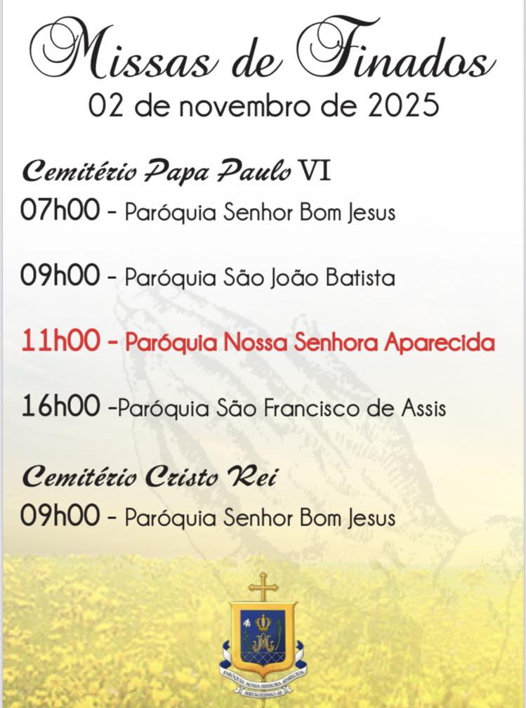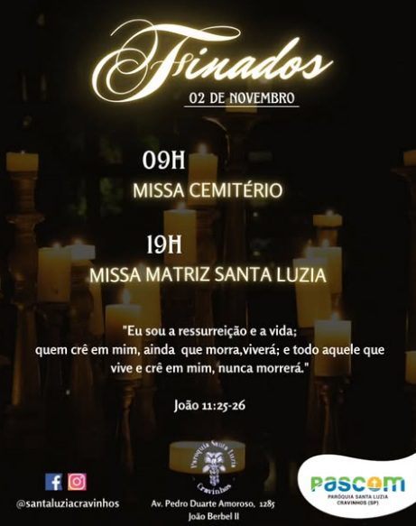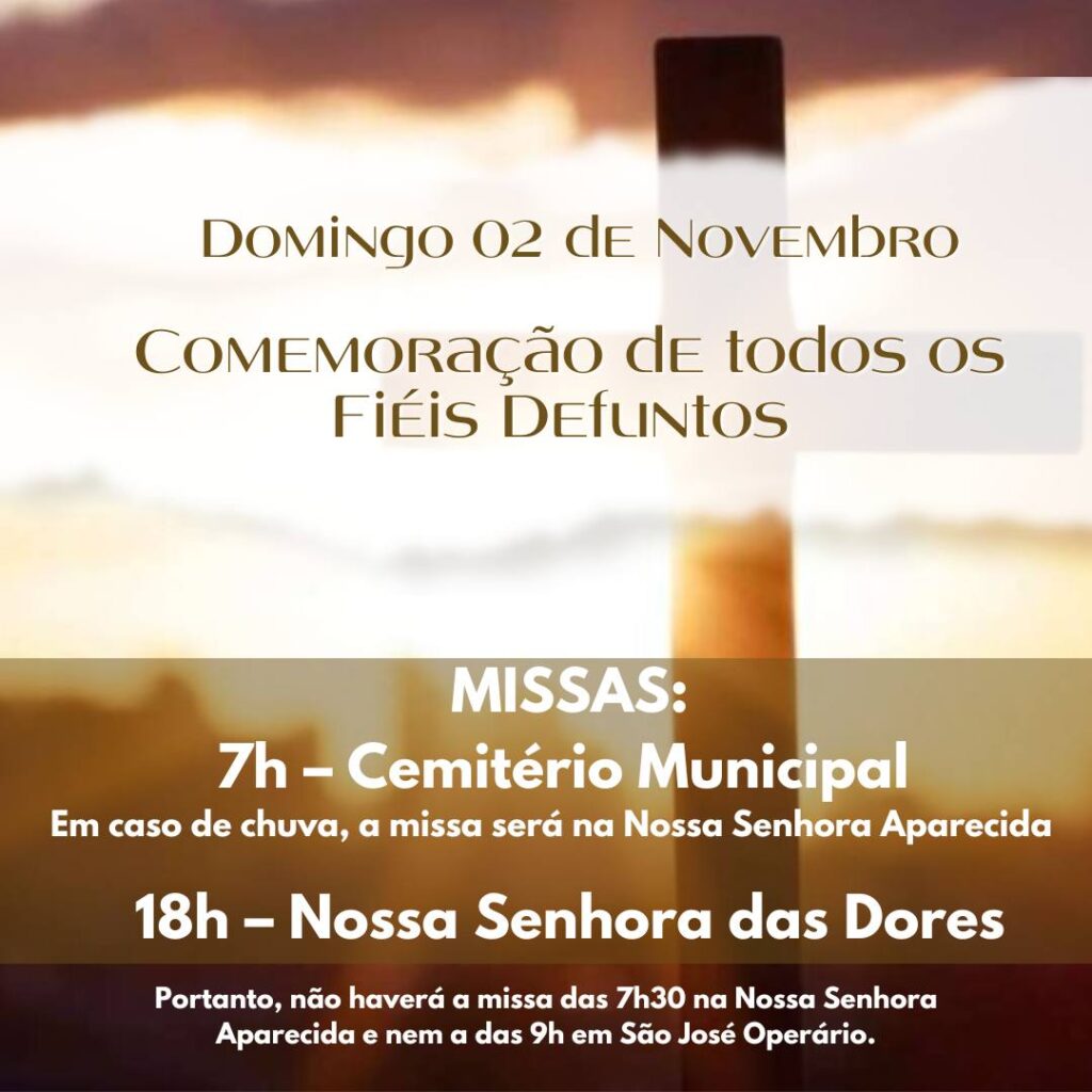 01 e 02 de novembro: Missas nos locais e horários de costume