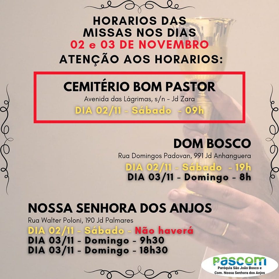 Missas no Cemitério da Saudade: 7h, 9h (Dom Moacir) e 16h