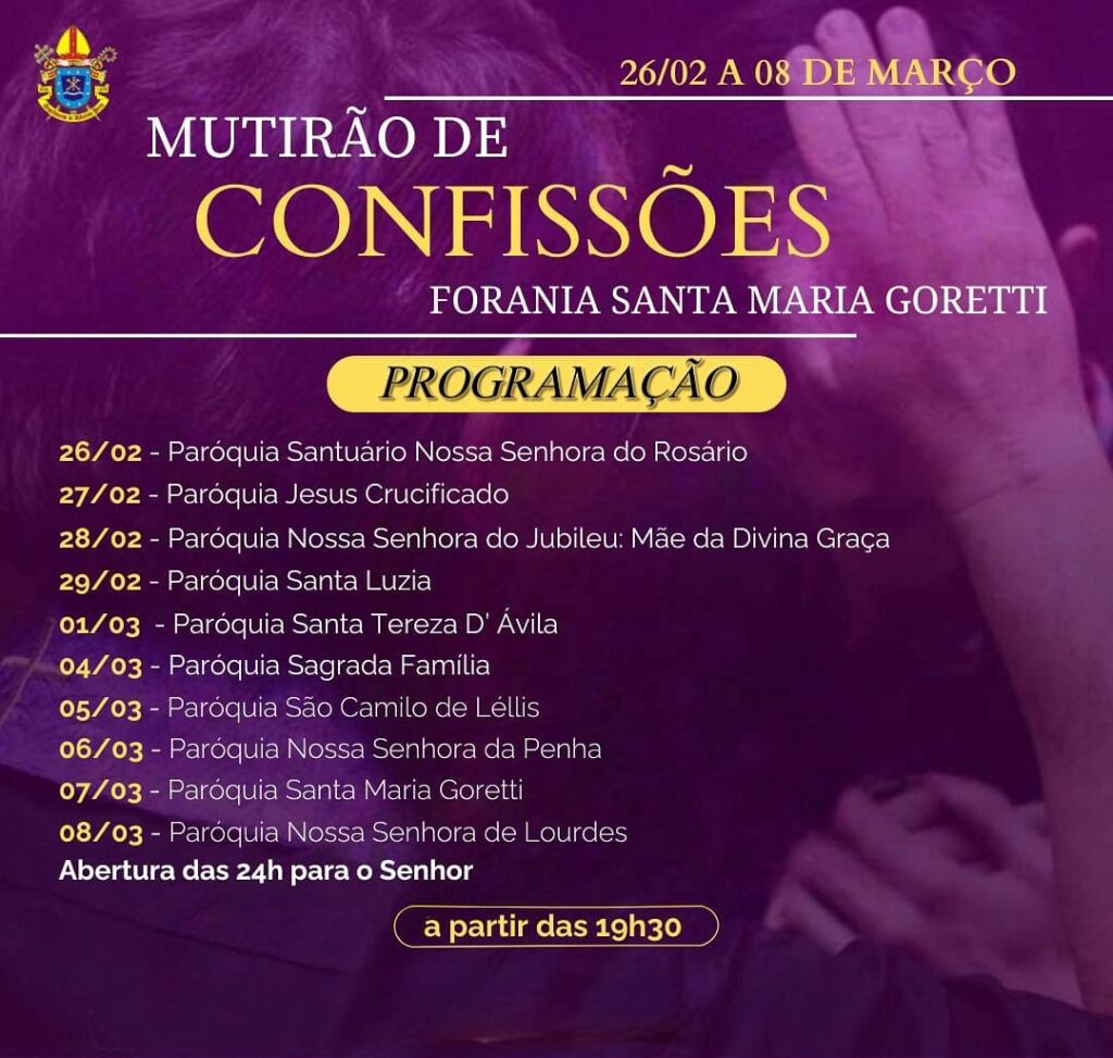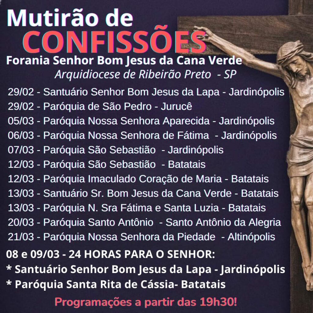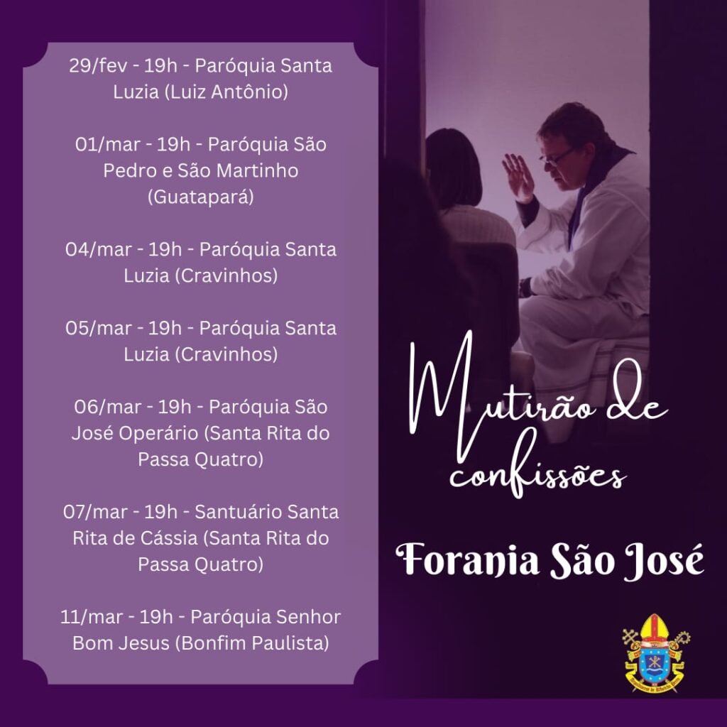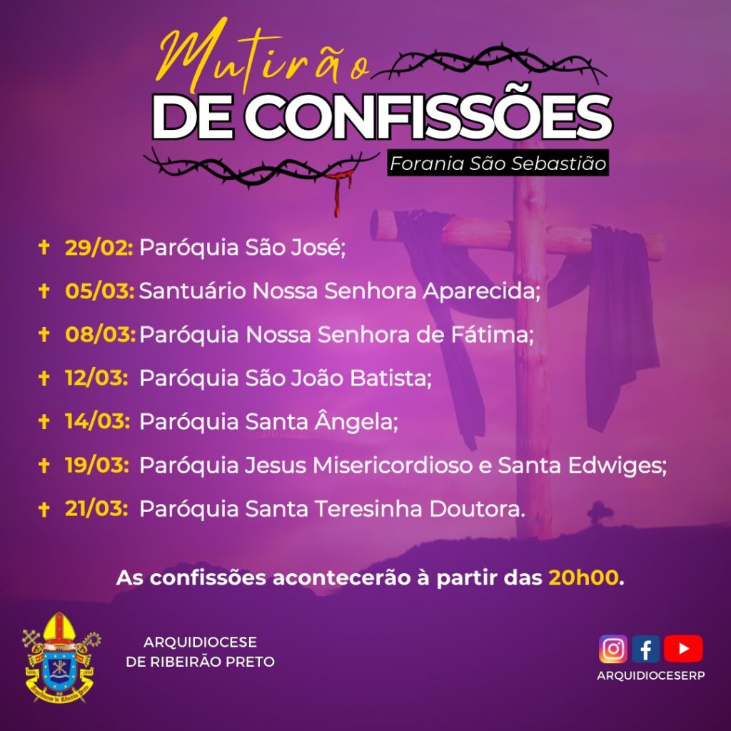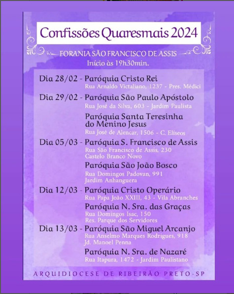 Com o objetivo de atender as confissões no tempo quaresmal, as paróquias das foranias da Arquidiocese de Ribeirão Preto, organizam o calendário forâneo para atendimento das confissões.  Confira a programação: