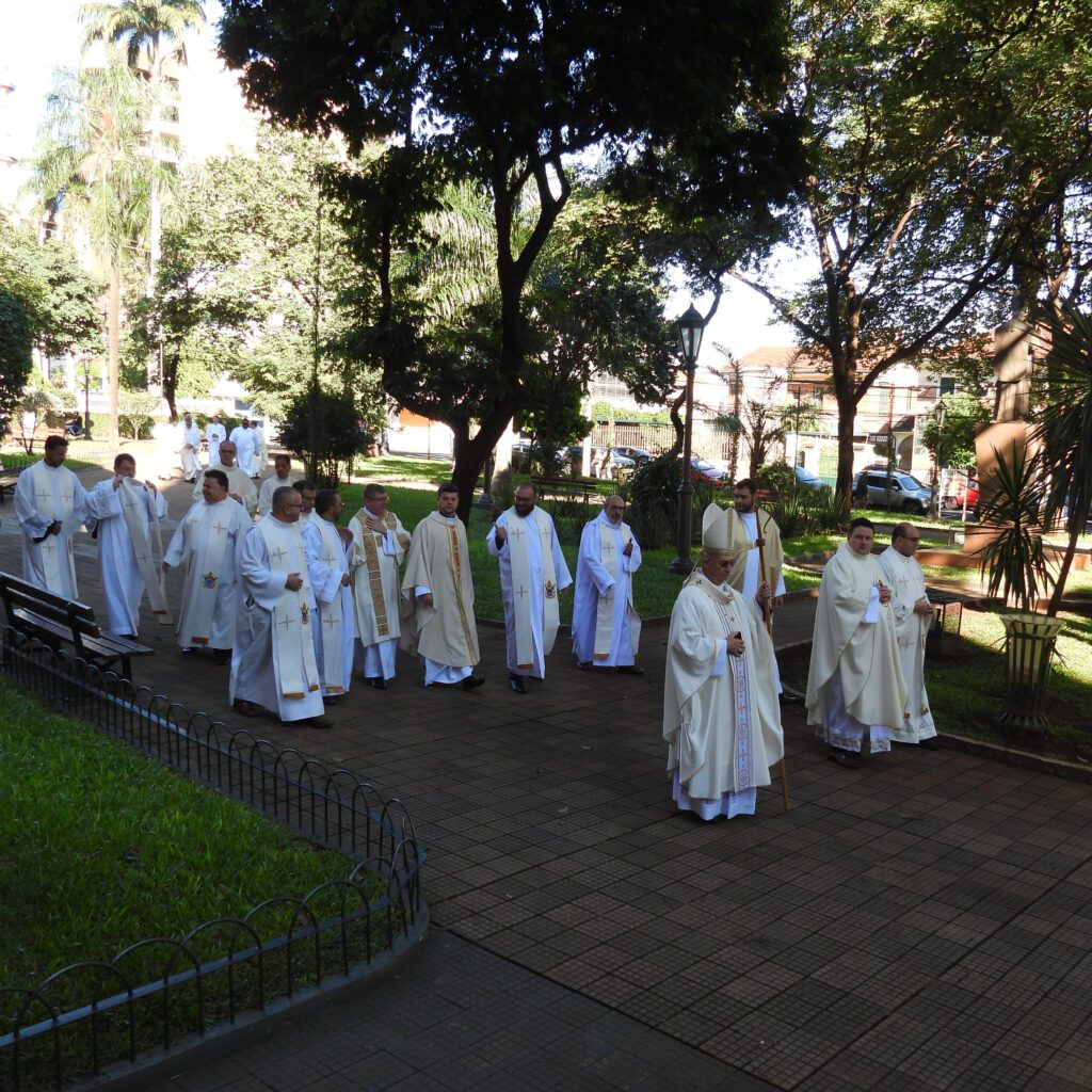 “Neste dia tão santo, em que celebramos a instituição da Eucaristia e do Sacerdócio, queremos elevar a Deus nossa profunda gratidão. Dia em que recordamos que o Sacerdócio nasce do coração de Cristo, que se doa na Eucaristia. Por isso, rendemos graças por cada sacerdote que torna presente entre nós esse mistério de amor, alimentando-nos com a palavra e com o pão da vida. Em primeiro lugar, agradecemos ao nosso Arcebispo Dom Moacir por sua paternidade, zelo pastoral e fidelidade à missão que lhe foi confiada. Sua condução nos fortalece na unidade e na comunhão da Igreja. De modo especial, queremos também agradecer aos padres que este ano celebrarão 25 anos de ordenação presbiteral:. Acássio, Amauri Sérgio, Ângelo Crivelaro, Edimário Gomes, Giovanni Vieira, Marcos Cândido e Marcos da Matta. Este tempo não é apenas a marca dos anos, mas o testemunho de uma vida doada, fecunda e perseverante no serviço ao povo de Deus. São 25 anos de fidelidade ao chamado de Cristo, 25 anos de altar, de palavra, de Eucaristia. Louvamos a Deus pelo dom de suas vidas, por sua entrega generosa, pelo testemunho fiel e pelo serviço incansável ao povo de Deus. Lembremos também do Cônego Pedro Carlos que no dia 1º de janeiro deste ano completou 40 anos de vida sacerdotal. E aos padres: Antônio Carlos Roberto da Paz, Aparecido Donizeti Maciel, Hélio Tadeu da Silva, Ilson Vicente Olimpio, José Aparecido Borini, Sérgio Donizeti Carmona, que completarão 30 anos de sacerdócio. Que Deus continue sustentando e fortalecendo cada um de nossos pastores para que permaneçam firmes na missão com alegria e fidelidade”.