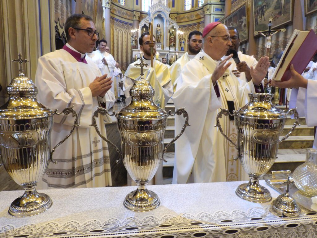 A Catedral Metropolitana de São Sebastião, em Ribeirão Preto, acolheu na manhã da Quinta-feira Santa, 02 de abril, às 9 horas, os padres, diáconos, seminaristas, candidatos da Escola Diaconal, fiéis da Arquidiocese de Ribeirão Preto para a concelebração eucarística da Missa Crismal, conhecida também como Missa da Unidade ou Missa dos Santos Óleos, presidida pelo arcebispo dom Moacir Silva. Na missa os padres renovaram e reafirmaram o compromisso ao serviço de Deus em unidade do seu sacerdócio no único grande, sumo e eterno Sacerdote, Jesus Cristo, comprometidos de servir à Palavra de Deus e, nutridos pelo desejo de santificar a Igreja, continuar no serviço a Deus e aos irmãos e irmãs; e também foram abençoados os Santos Óleos da Crisma, dos Enfermos e do Batismo. Após os ritos finais da missa os representantes das 95 paróquias Paróquias (Santuários Arquidiocesanos, Santuários Arquidiocesanos Paróquias, Quase Paróquia, Reitorias e Área Pastoral), receberam das mãos do arcebispo as caixinhas com os vidros dos Santos Óleos a serem levadas as suas respectivas comunidades paroquiais.