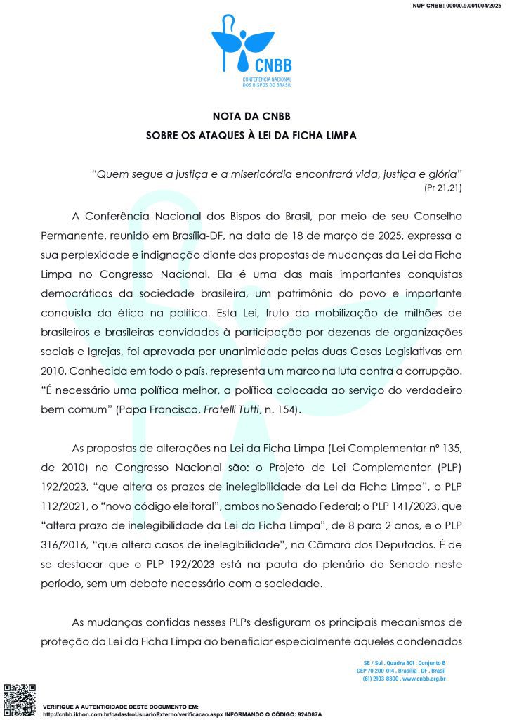 A lei, segundo os membros do Conselho Permanente da CNBB, é fruto da mobilização de milhões de brasileiros e brasileiras convidados à participação por dezenas de organizações sociais e Igrejas, foi aprovada por unanimidade pelas duas Casas Legislativas em 2010. Conhecida em todo o país, representa um marco na luta contra a corrupção. O texto reforço um trecho da Fratelli Tutti, sobre a política: “É necessário uma política melhor, a política colocada ao serviço do verdadeiro bem comum” (Papa Francisco, Fratelli Tutti, n. 154).