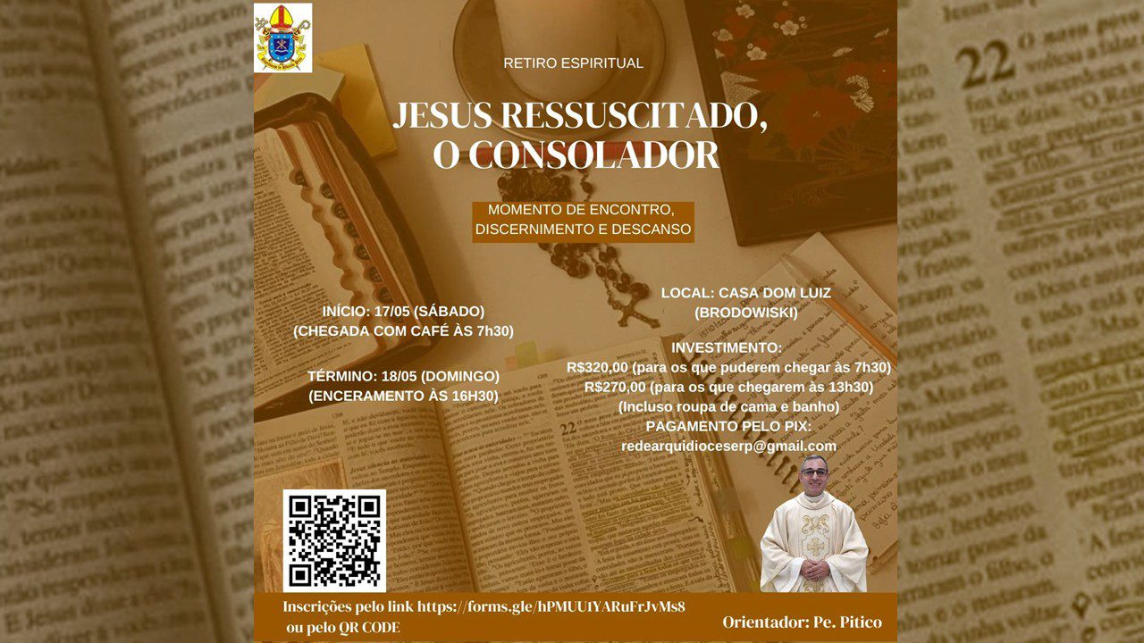 Nos dias 17 e 18 de maio, na Casa de Retiros Dom Luís, em Brodowski, acontece o Retiro Espiritual: Jesus Ressuscitado, o Consolador – Momento de Encontro, Discernimento e Descanso.