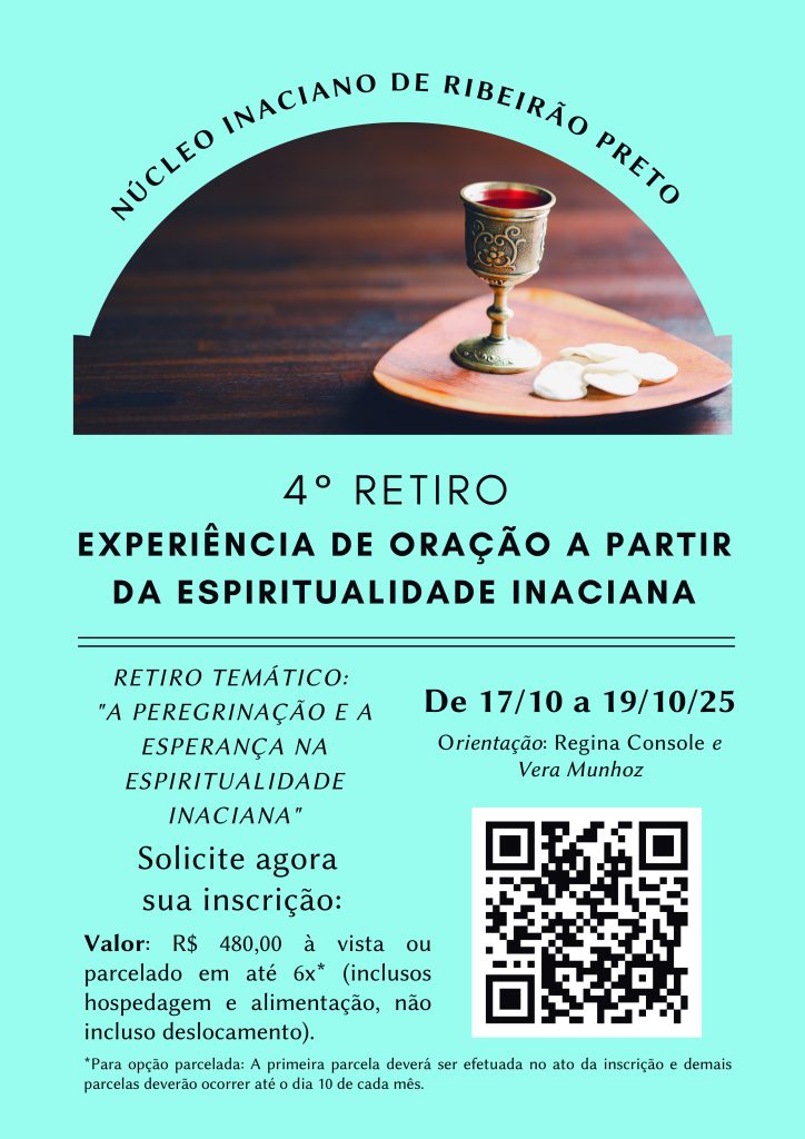 O Núcleo Inaciano de Ribeirão Preto realiza de 17 a 19 de outubro de 2025, na Casa Dom Luís, em Brodowski, o “4° Retiro Experiência de Oração a partir da Espiritualidade Inaciana”. O retiro temático: “A peregrinação e a esperança na espiritualidade inaciana” terá a orientação de Regina Console e Vera Munhoz. O retiro tem o apoio e recomendação da Arquidiocese de Ribeirão Preto.