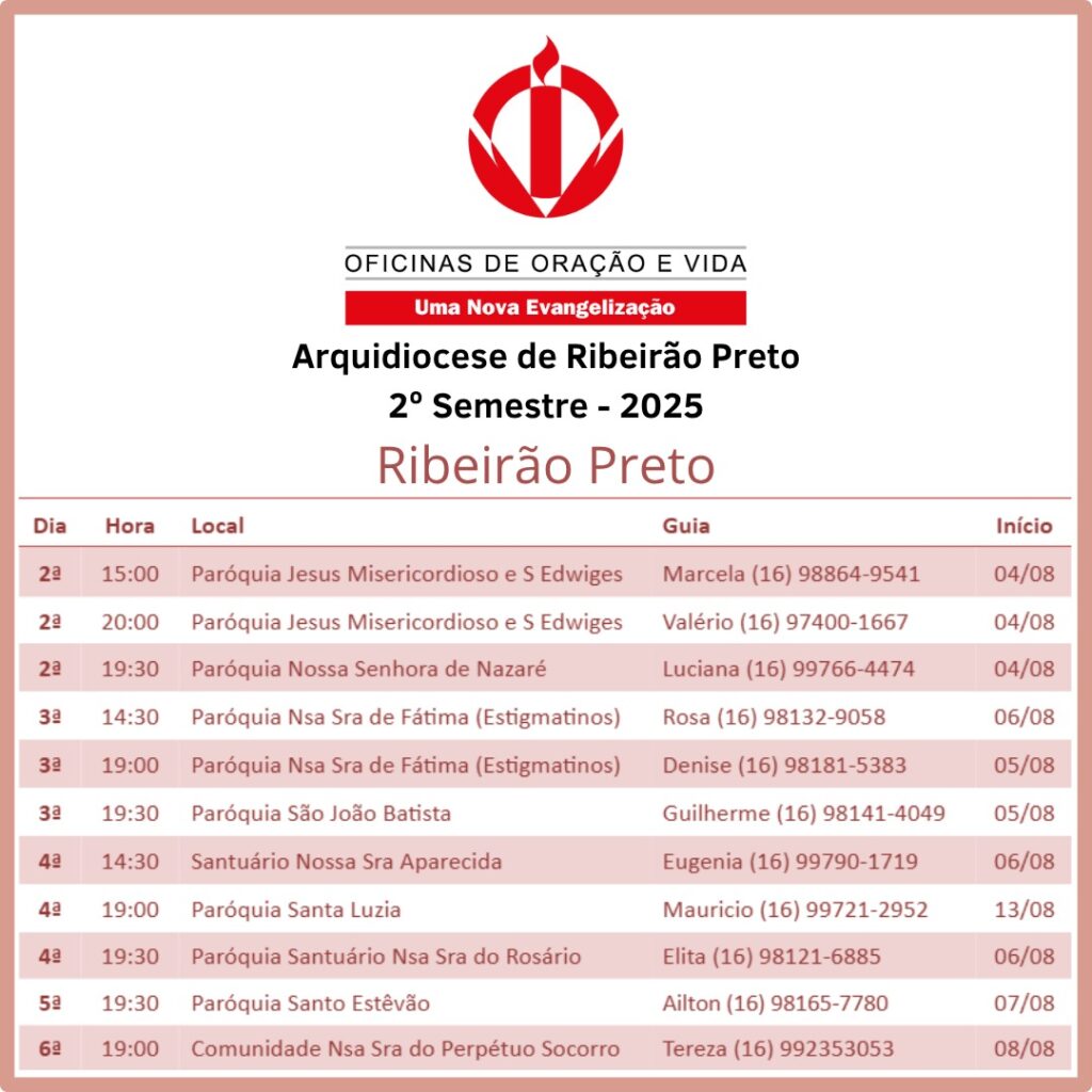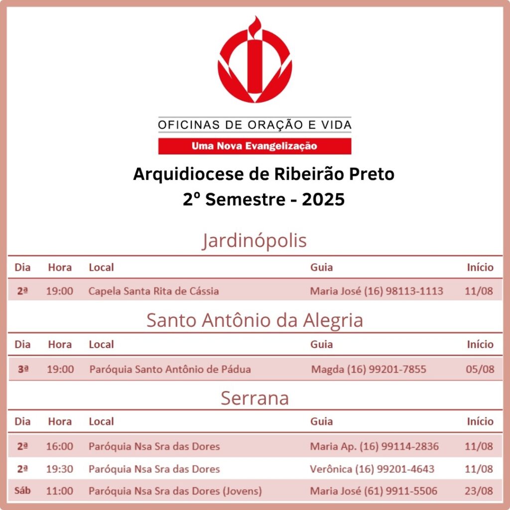 A coordenação arquidiocesana das Oficinas de Oração e Vida apresenta o calendário para o segundo semestre de 2025, das oficinas com os dias, horários e contato das paróquias e coordenadores nas cidades de Ribeirão Preto, Jardinópolis, Santo Antônio da Alegria e Serrana.