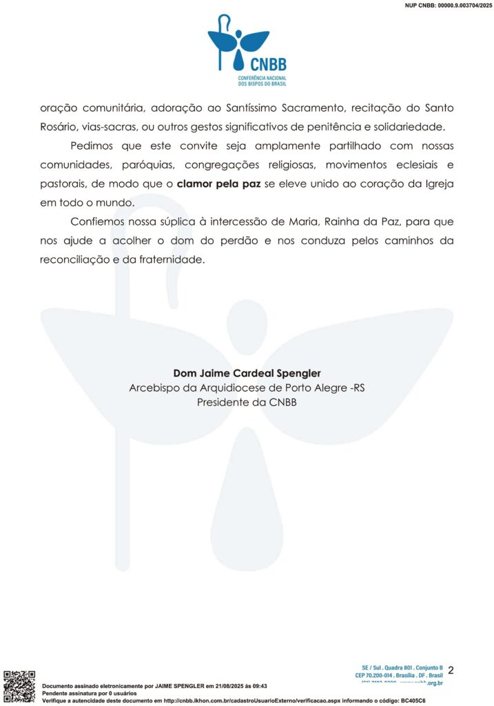 O presidente da CNBB, Cardeal Jaime Spengler, enviou uma carta aos bispos do Brasil convidando toda a Igreja a se unir em oração e jejum pela paz.