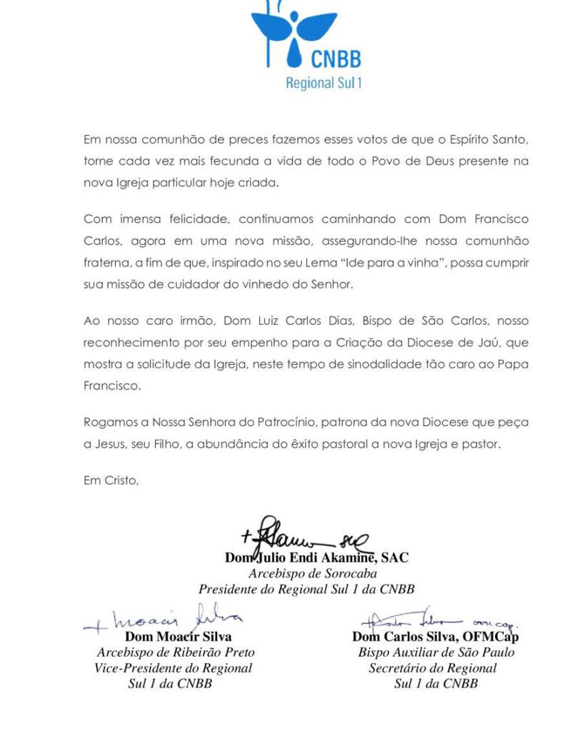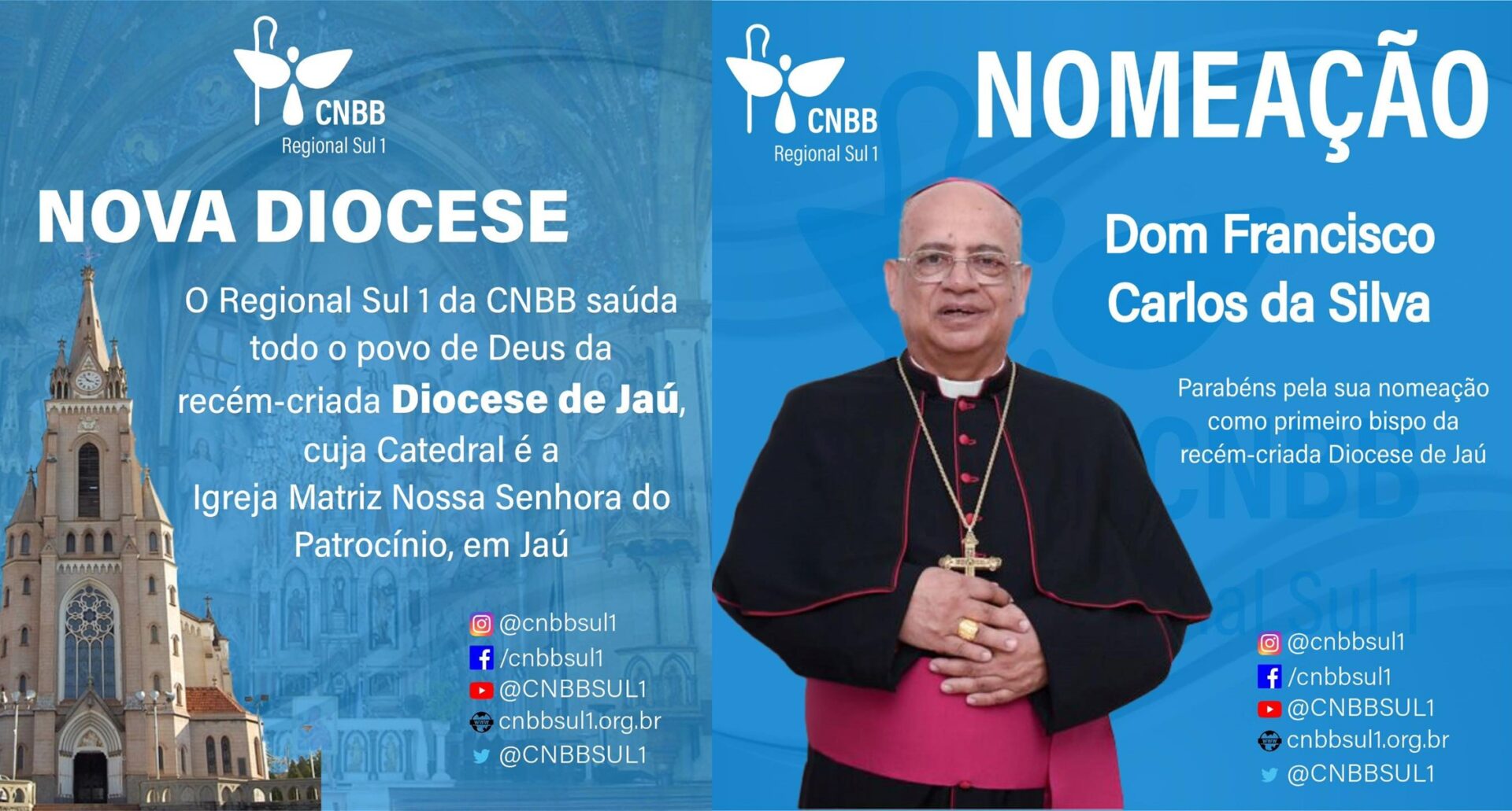 A presidência do Regional Sul 1 da CNBB saúda o povo de Deus da Diocese de Jaú, criada hoje pelo Papa Francisco!