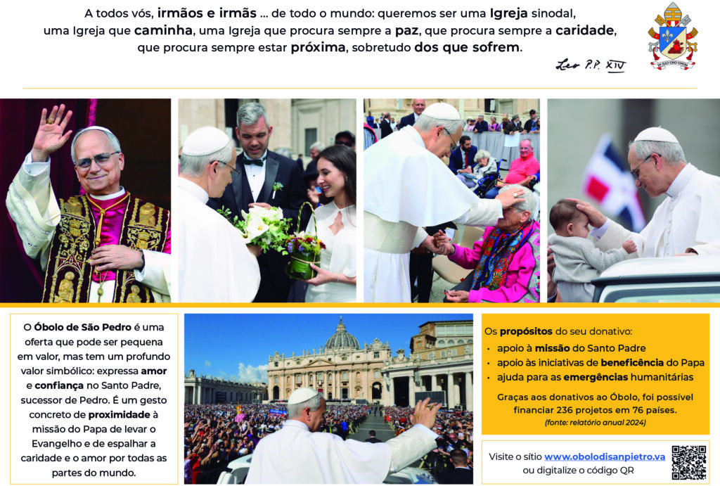 A Coleta do Óbolo de São Pedro será feita em todas as paróquias da Arquidiocese de Ribeirão Preto, nas missas da Solenidade de São Pedro e São Paulo, Apóstolos, em 29 de junho de 2025.