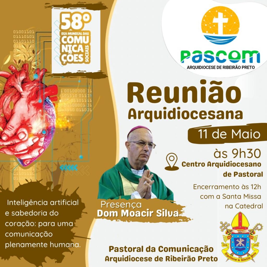 A Pastoral da Comunicação da Arquidiocese de Ribeirão Preto promove reunião celebrativa nas comemorações do 58º Dia Mundial das Comunicações. O encontro será no sábado, 11 de maio, às 9h30, no Centro Arquidiocesano de Pastoral, às 9h30, e contará com a presença do arcebispo Dom Moacir Silva.