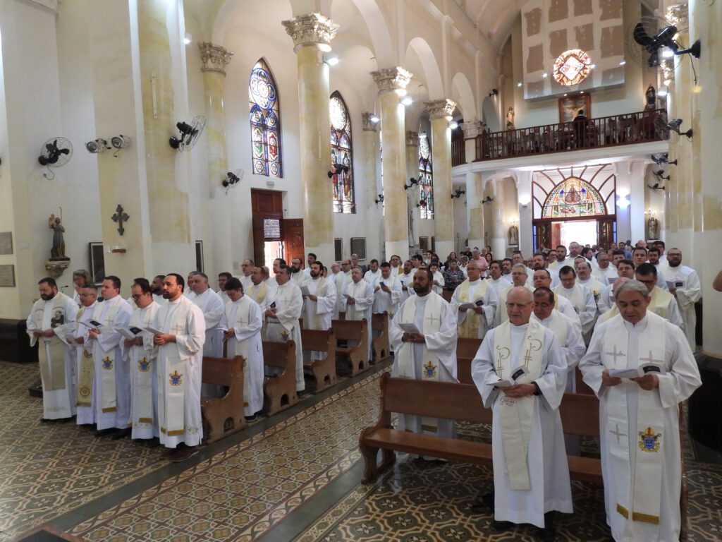 Dom Moacir citou o agradecimento do papa aos sacerdotes, e a importância de viver o ministério na missão e no serviço. “É por isso que queremos redescobrir juntos o impulso missionário. Uma missão que propõe com coragem e amor o Evangelho de Jesus. Através da nossa ação pastoral, é o próprio Senhor que cuida do seu rebanho, reúne quem está disperso, inclina-se sobre quem está ferido, apoia quem está desanimado. Imitando o exemplo do Mestre, cresçamos na fé e tornemo-nos assim testemunhas críveis da vocação que recebemos. Quando alguém crê, isso vê-se: a felicidade do ministro reflete o seu encontro com Cristo, sustentando-o na missão e no serviço. Queridos irmãos no sacerdócio, disse o Papa, obrigado a cada um de vós pela dedicação quotidiana, sobretudo nos lugares de formação, nas periferias existenciais e nos lugares difíceis, por vezes, perigosos. Ao recordar os sacerdotes que deram a vida, mesmo até ao derramamento de sangue, renovemos hoje a nossa disponibilidade para viver sem reservas um apostolado de compaixão e alegria. Obrigado pelo que sois! Pois recordais a todos que é belo ser sacerdote e que cada chamamento do Senhor é, principalmente, um chamamento à sua alegria. Não somos perfeitos, mas somos amigos de Cristo, irmãos uns dos outros e filhos da sua terna Mãe Maria, e isto basta-nos”.