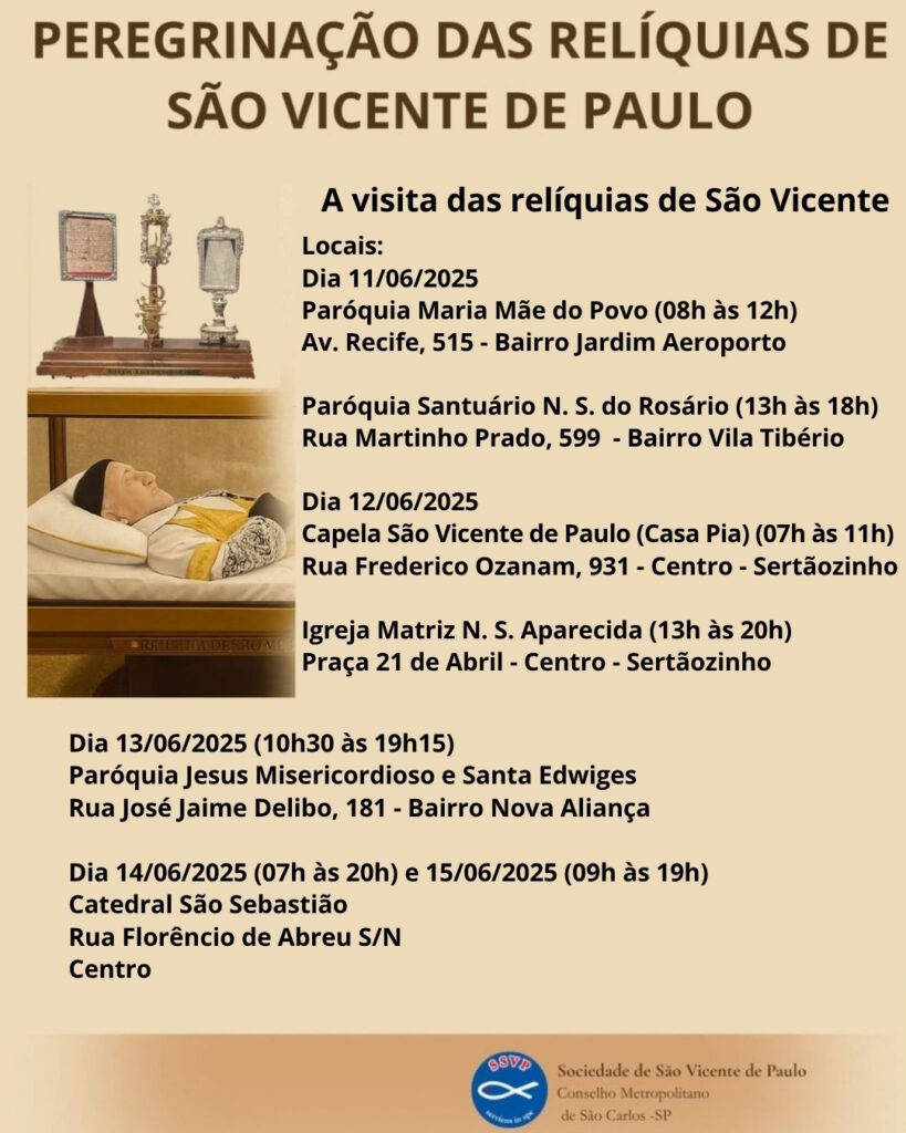 De 11 a 15 de junho, nas comemorações dos 400 anos de fundação da Congregação da Missão de São Vicente de Paulo, a Sociedade São Vicente de Paulo (conhecidos como lazaristas ou lazaristas ou padres e irmãos vicentinos), presente na Arquidiocese de Ribeirão Preto, promove a peregrinação das relíquias de São Vicente de Paulo. O objetivo é promover o crescimento espiritual, o carisma vicentino e vocações.