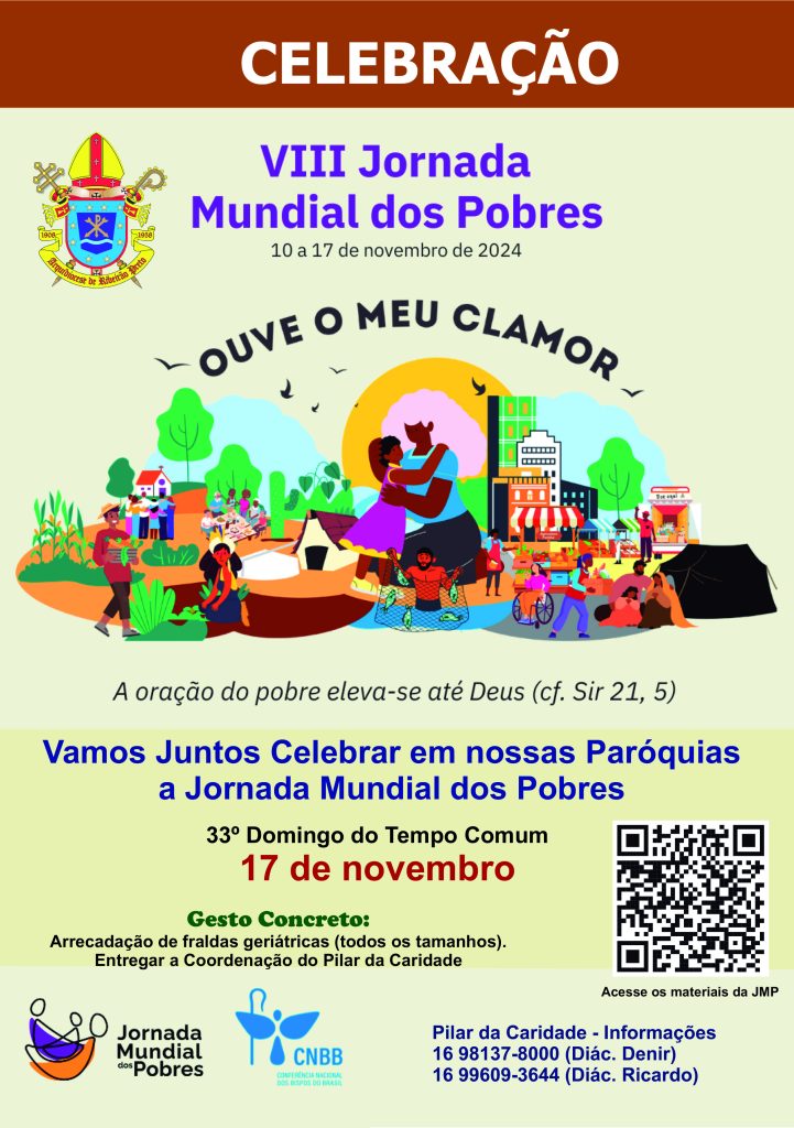 Com o tema: “Ouve o meu clamor” e o lema: “A oração do pobre eleva-se até Deus” (cf. Sir 21, 5), de 10 a 17 de novembro, ocorre a oitava edição da Jornada Mundial dos Pobres (JMP). A temática nos convida a seguir o chamado do Papa Francisco: abrir nossos corações à oração e à solidariedade com os mais necessitados. Que esta jornada nos una em encontros, convivência, escuta e cuidado, para podermos caminhar juntos, como irmãos e irmãs, construindo um mundo mais justo e fraterno para todos.