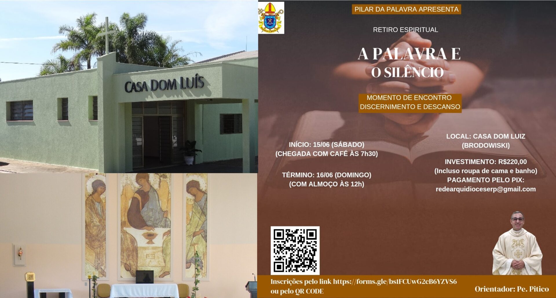 O Pilar da Palavra apresenta o Retiro Espiritual: A Palavra e o Silêncio – Momento de Encontro, Discernimento e Descanso, na Casa Dom Luís, em Brodowski, com início no dia 15 de junho (chegada com o café, às 7h30) e término no dia 16 com o almoço, às 12h.