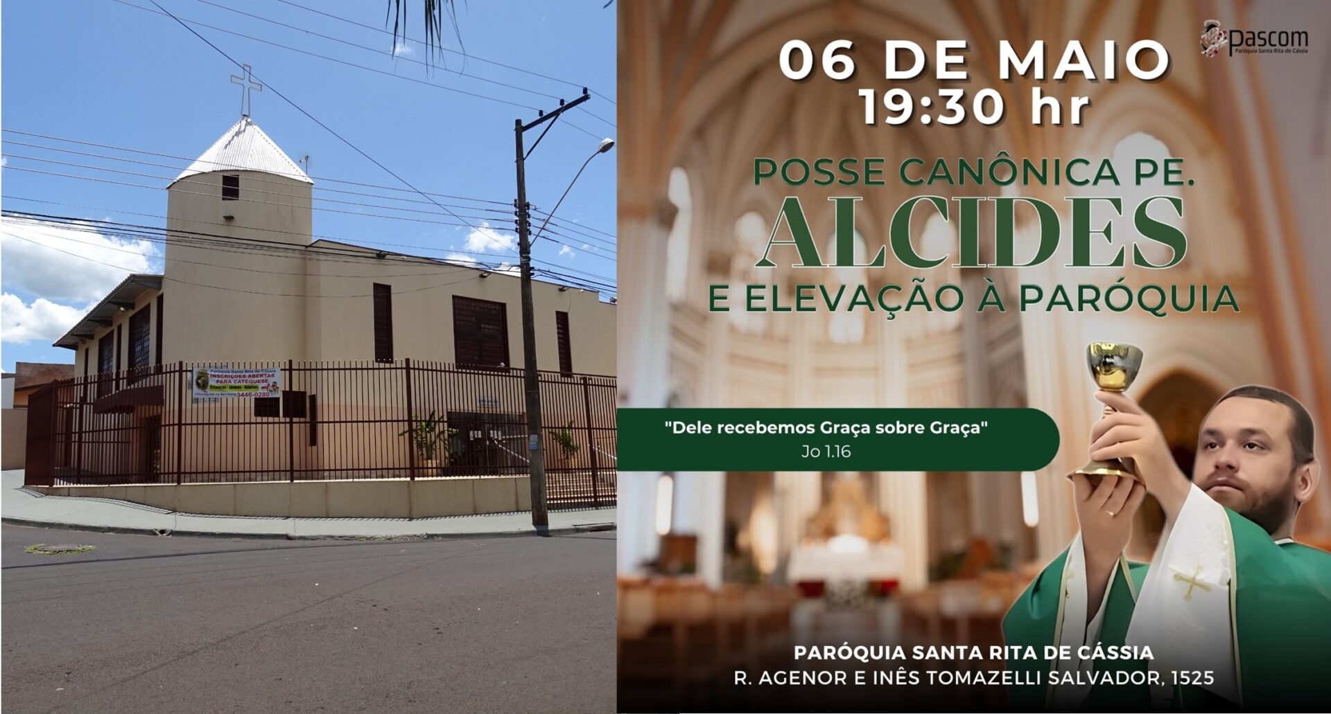 A Comunidade da Quase Paróquia Santa Rita de Cássia tem a alegria de convidar a todos para a Missa de Elevação à Paróquia e posse Canônica de seu Pároco, Padre Alcides Pizeta Neto, presidida pelo Arcebispo Dom Moacir Silva.