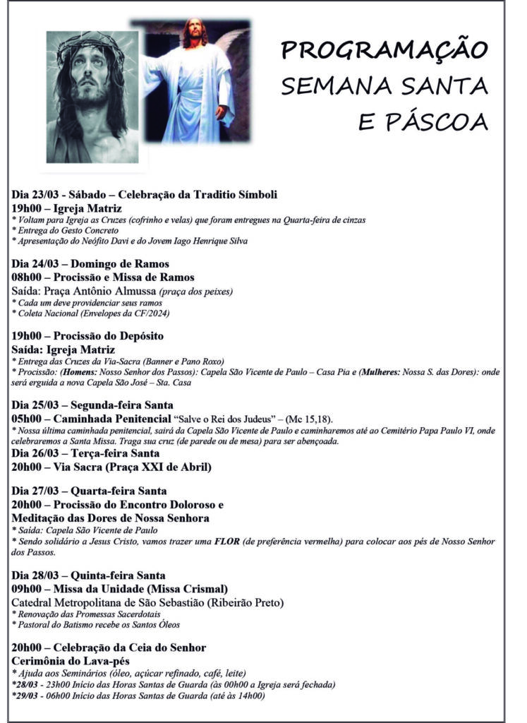 Missas: 9h (Bênção dos Ramos e Procissão) / 17h e 19h (sem procissão)
