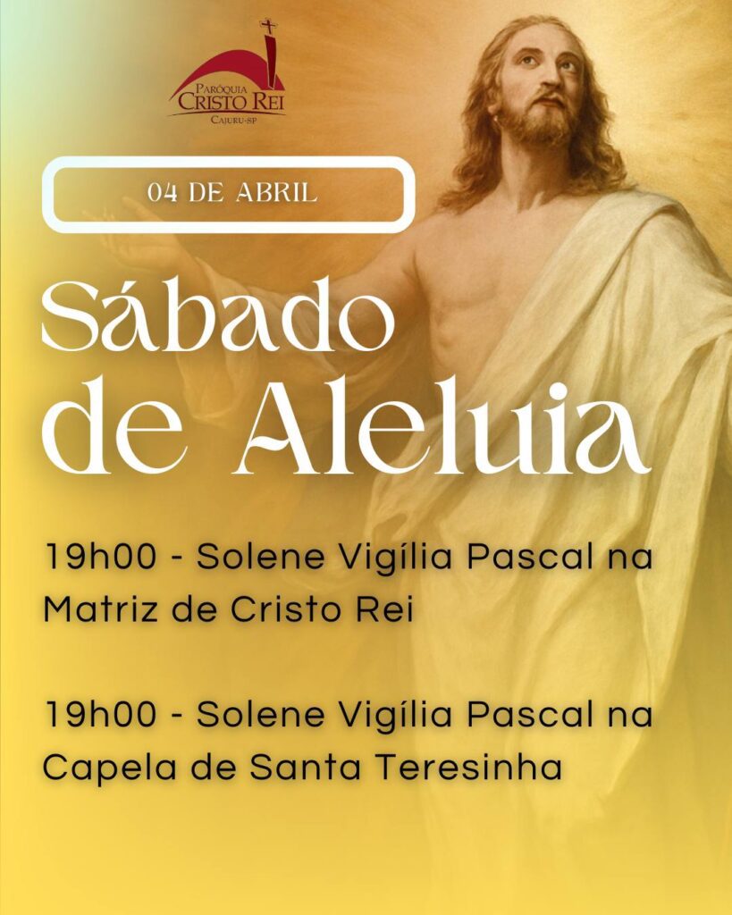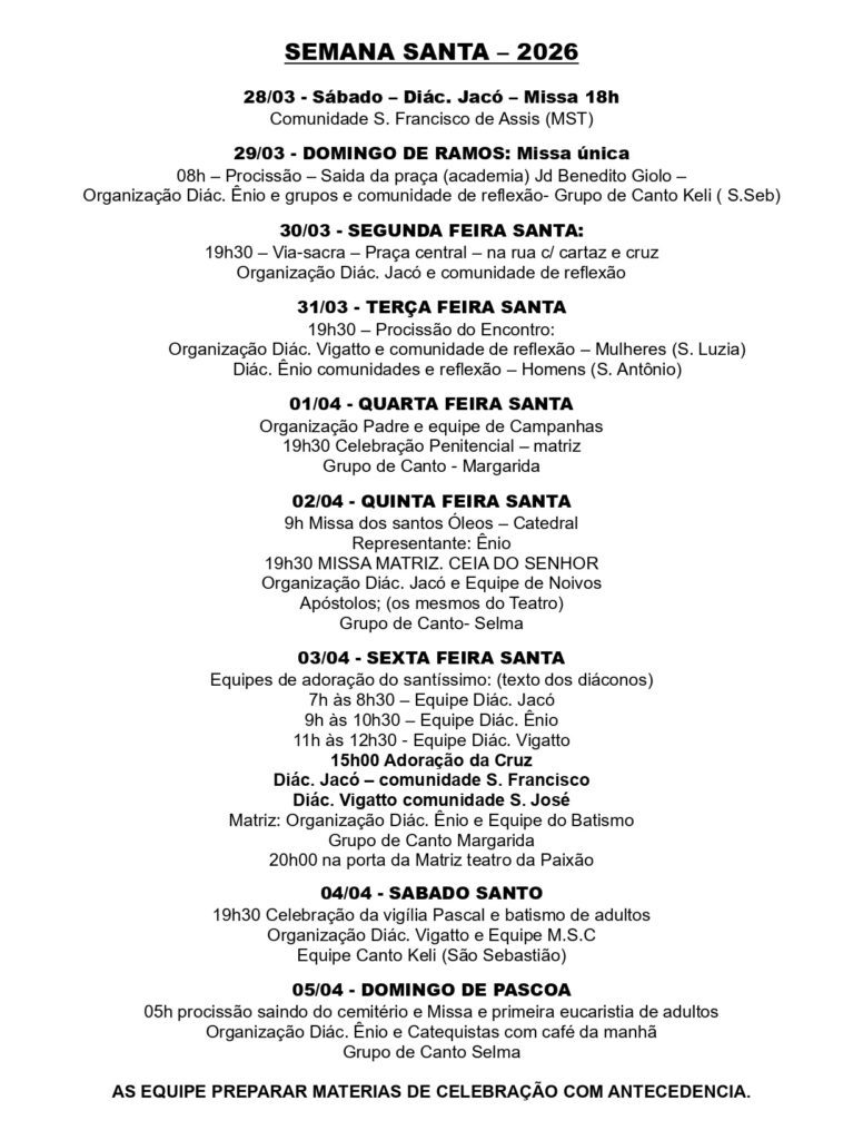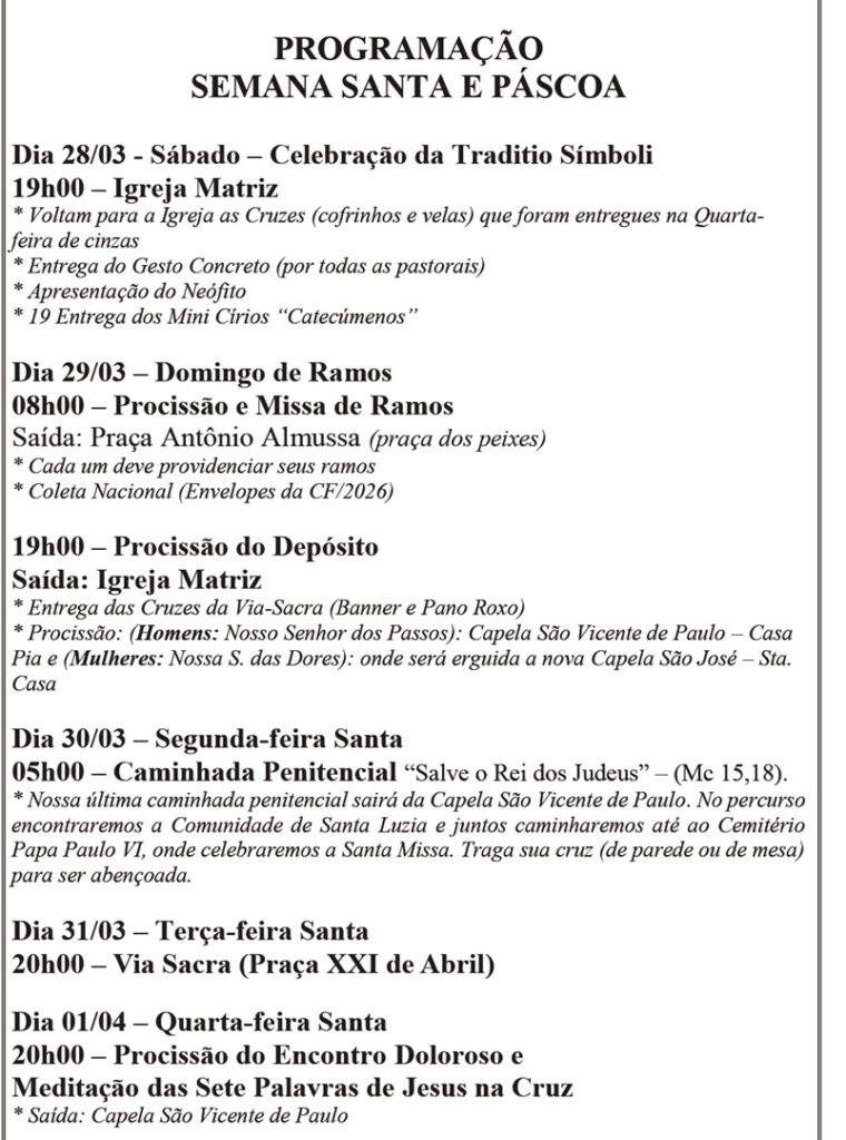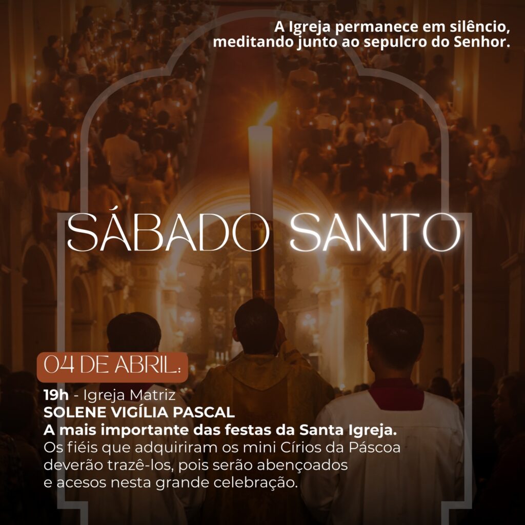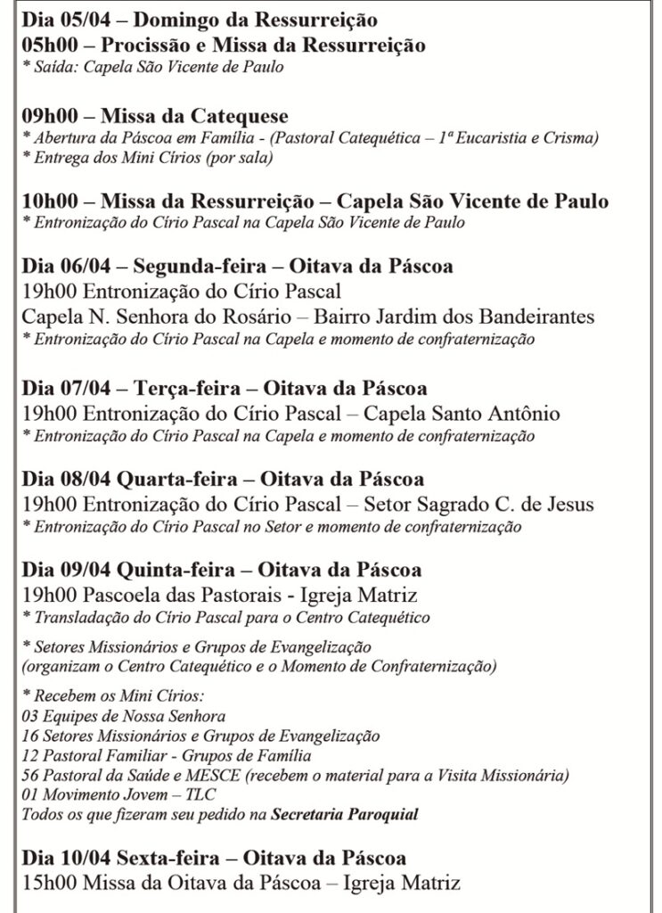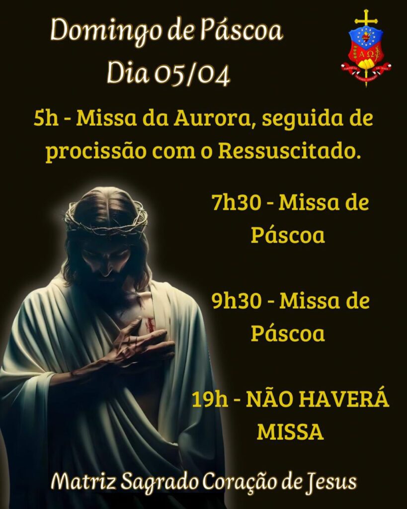 Obs.: terminada esta celebração, nos reuniremos com todos os coroinhas, acólitos e clarissas no Salão São João Paulo ll, para o costumeiro “momento pascal” junto a este querido e especial grupo.